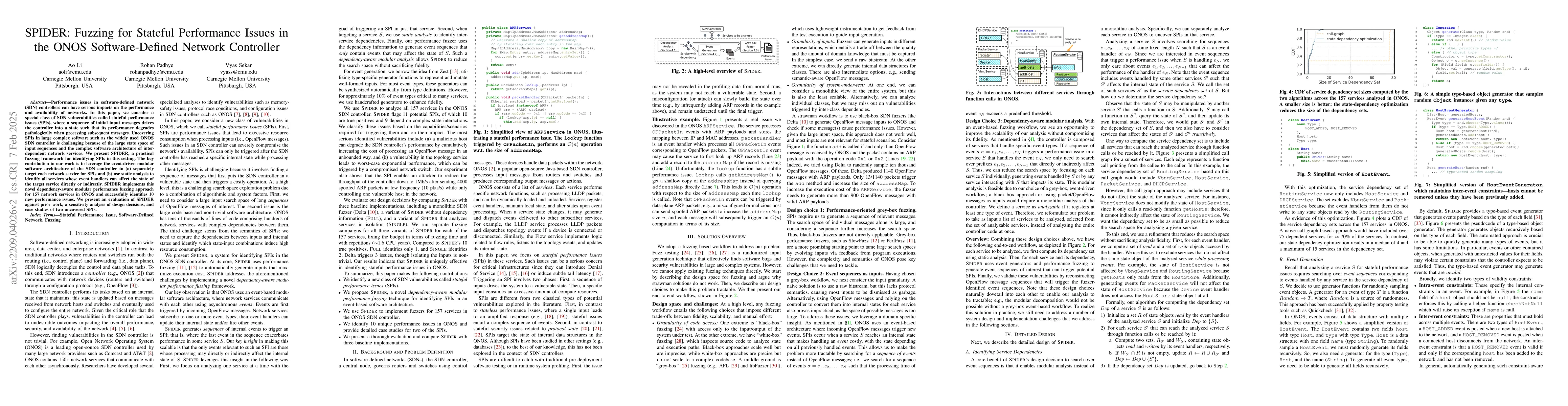 SPIDER is a practical fuzzing framework designed to uncover stateful performance issues in SDN controllers by addressing challenges like large input spaces and complex code bases. The framework integrates semantic fuzzing, performance fuzzing, and static analysis to effectively identify performance degradations caused by specific input sequences.