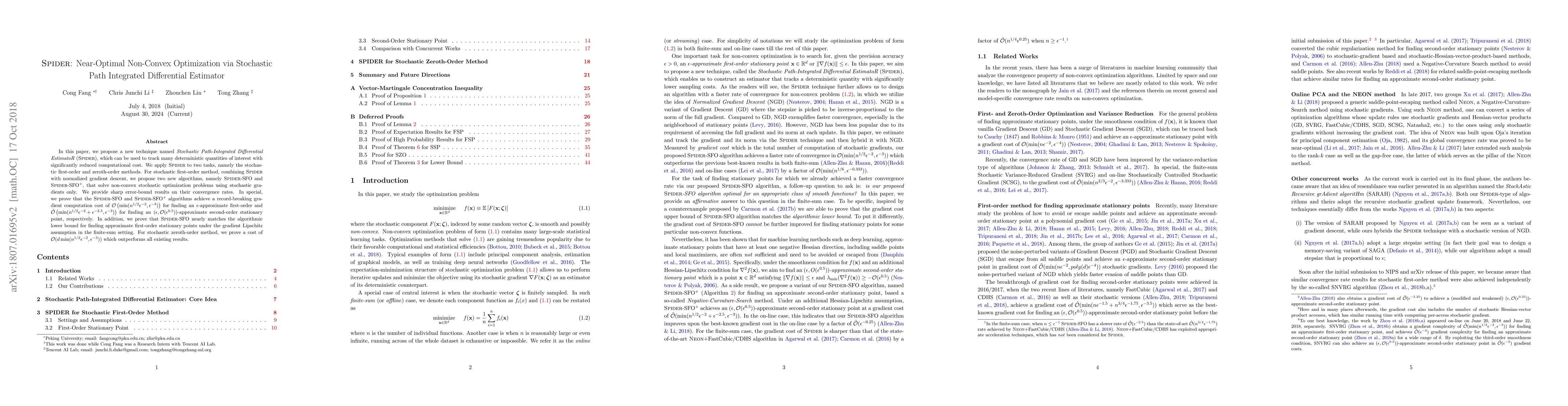 In this paper, we propose a new technique named \textit{Stochastic Path-Integrated Differential EstimatoR} (SPIDER), which can be used to track many deterministic quantities of interest with significantly reduced computational cost. We apply SPIDER to two tasks, namely the stochastic first-order and zeroth-order methods. For stochastic first-order method, combining SPIDER with normalized gradient descent, we propose two new algorithms, namely SPIDER-SFO and SPIDER-SFO\textsuperscript{+}, that solve non-convex stochastic optimization problems using stochastic gradients only. We provide sharp error-bound results on their convergence rates. In special, we prove that the SPIDER-SFO and SPIDER-SFO\textsuperscript{+} algorithms achieve a record-breaking gradient computation cost of $\mathcal{O}\left( \min( n^{1/2} \epsilon^{-2}, \epsilon^{-3} ) \right)$ for finding an $\epsilon$-approximate first-order and $\tilde{\mathcal{O}}\left( \min( n^{1/2} \epsilon^{-2}+\epsilon^{-2.5}, \epsilon^{-3} ) \right)$ for finding an $(\epsilon, \mathcal{O}(\epsilon^{0.5}))$-approximate second-order stationary point, respectively. In addition, we prove that SPIDER-SFO nearly matches the algorithmic lower bound for finding approximate first-order stationary points under the gradient Lipschitz assumption in the finite-sum setting. For stochastic zeroth-order method, we prove a cost of $\mathcal{O}( d \min( n^{1/2} \epsilon^{-2}, \epsilon^{-3}) )$ which outperforms all existing results.