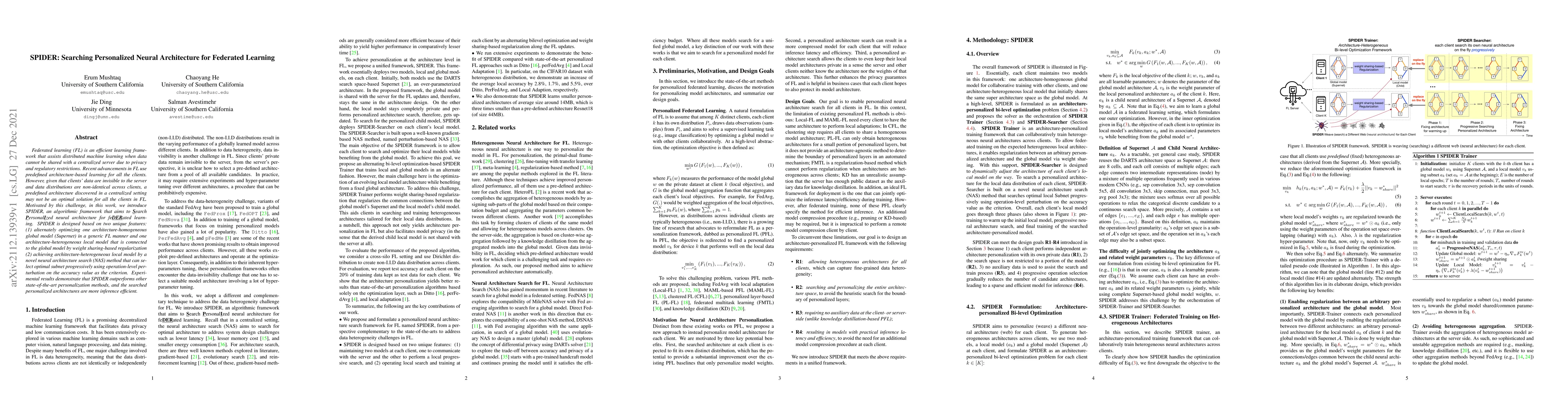 SPIDER is an algorithmic framework for searching personalized neural architectures in federated learning, optimizing both a global Supernet and local architecture-heterogeneous models through a novel neural architecture search method. Experimental results show SPIDER outperforms other personalization methods and achieves higher inference efficiency.