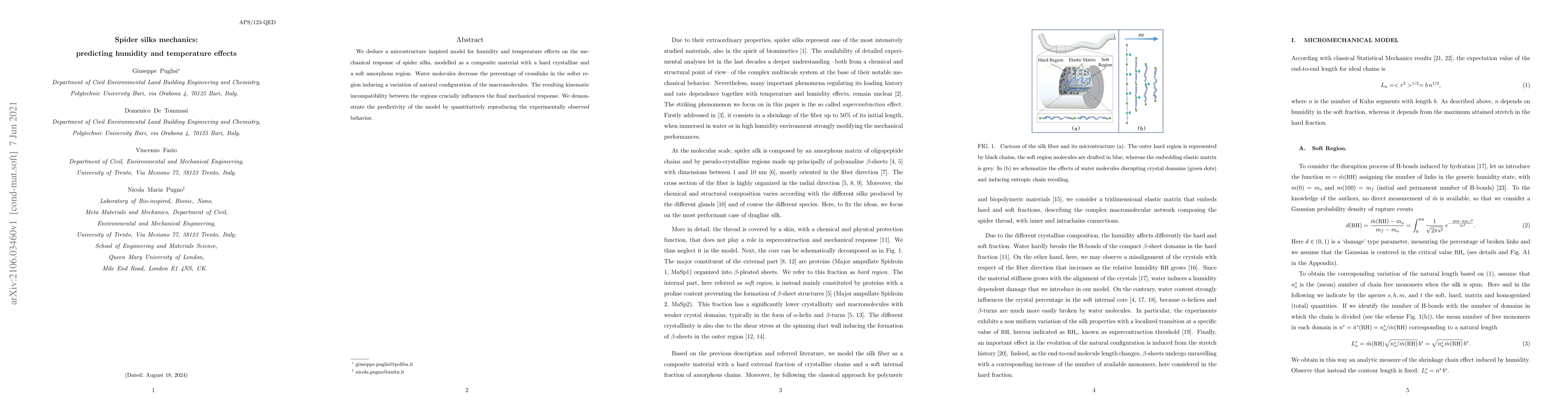 We deduce a microstructure inspired model for humidity and temperature effects on the mechanical response of spider silks, modelled as a composite material with a hard crystalline and a soft amorphous region. Water molecules decrease the percentage of crosslinks in the softer region inducing a variation of natural configuration of the macromolecules. The resulting kinematic incompatibility between the regions crucially influences the final mechanical response. We demonstrate the predictivity of the model by quantitatively reproducing the experimentally observed behavior