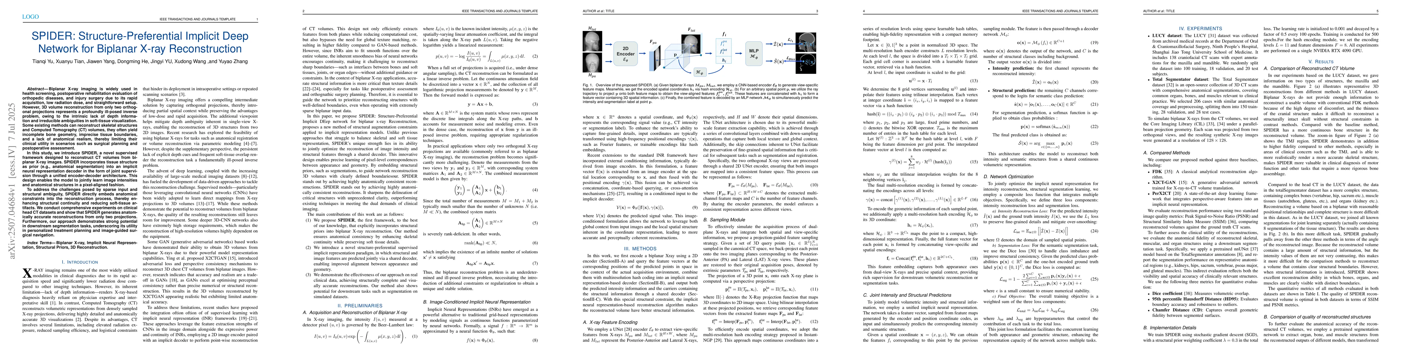 The research introduces SPIDER, a structure-preferential implicit deep network for biplanar X-ray reconstruction. It incorporates tissue structure as prior into an implicit neural representation decoder via joint supervision in a unified encoder-decoder architecture, enabling the model to learn image intensities and anatomical structures in a pixel-aligned fashion.