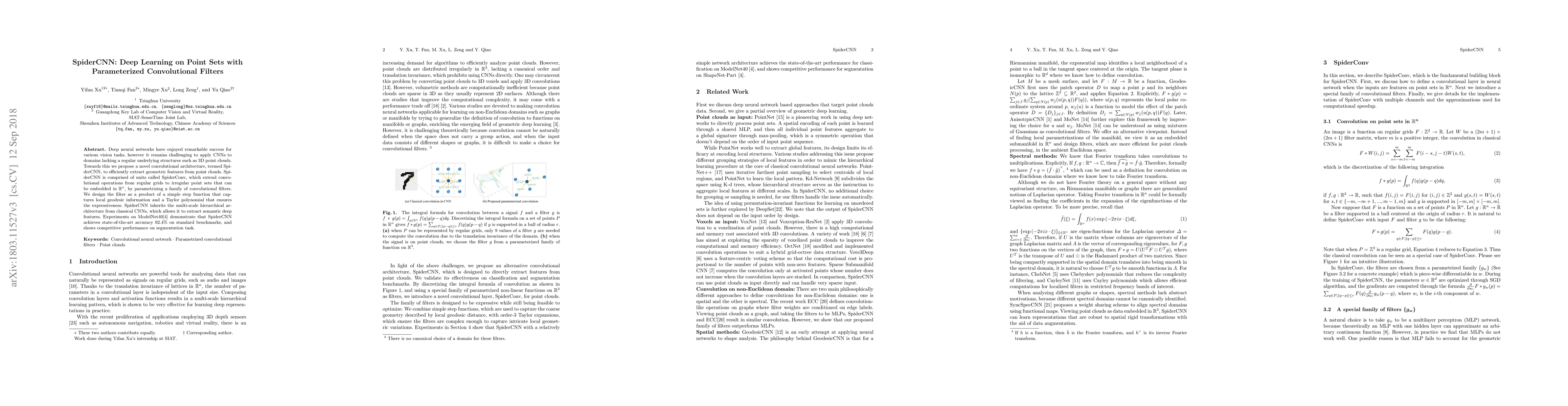Deep neural networks have enjoyed remarkable success for various vision tasks, however it remains challenging to apply CNNs to domains lacking a regular underlying structures such as 3D point clouds. Towards this we propose a novel convolutional architecture, termed SpiderCNN, to efficiently extract geometric features from point clouds. SpiderCNN is comprised of units called SpiderConv, which extend convolutional operations from regular grids to irregular point sets that can be embedded in R^n, by parametrizing a family of convolutional filters. We design the filter as a product of a simple step function that captures local geodesic information and a Taylor polynomial that ensures the expressiveness. SpiderCNN inherits the multi-scale hierarchical architecture from classical CNNs, which allows it to extract semantic deep features. Experiments on ModelNet40 demonstrate that SpiderCNN achieves state-of-the-art accuracy 92.4% on standard benchmarks, and shows competitive performance on segmentation task.