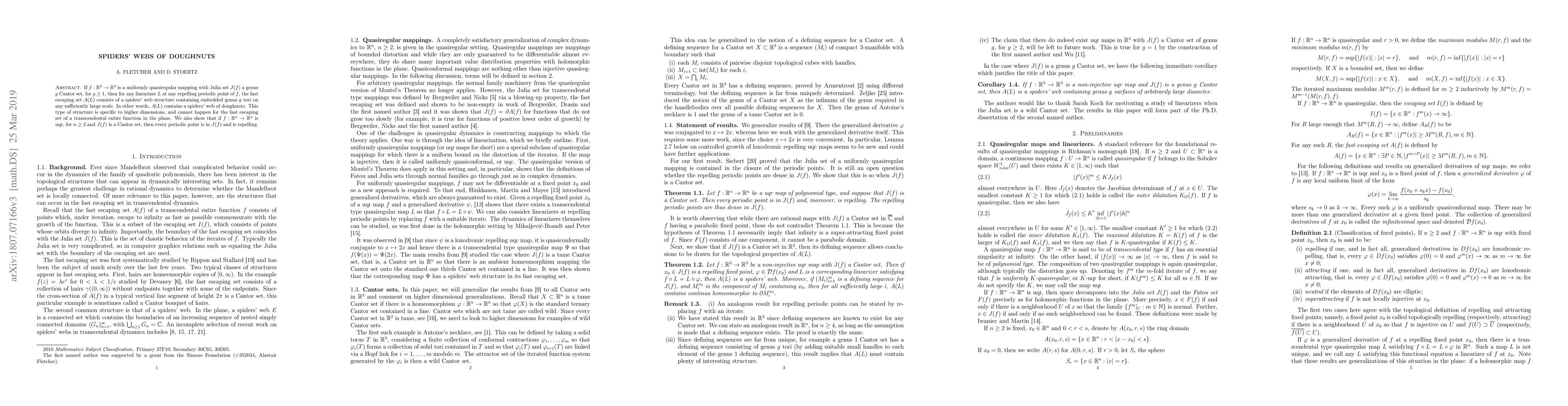 If $f:\mathbb{R}^3 \to \mathbb{R}^3$ is a uniformly quasiregular mapping with Julia set $J(f)$ a genus $g$ Cantor set, for $g\geq 1$, then for any linearizer $L$ at any repelling periodic point of $f$, the fast escaping set $A(L)$ consists of a spiders' web structure containing embedded genus $g$ tori on any sufficiently large scale. In other words, $A(L)$ contains a spiders' web of doughnuts. This type of structure is specific to higher dimensions, and cannot happen for the fast escaping set of a transcendental entire function in the plane. We also show that if $f:\mathbb{R}^n \to \mathbb{R}^n$ is uqr, for $n\geq 2$ and $J(f)$ is a Cantor set, then every periodic point is in $J(f)$ and is repelling.