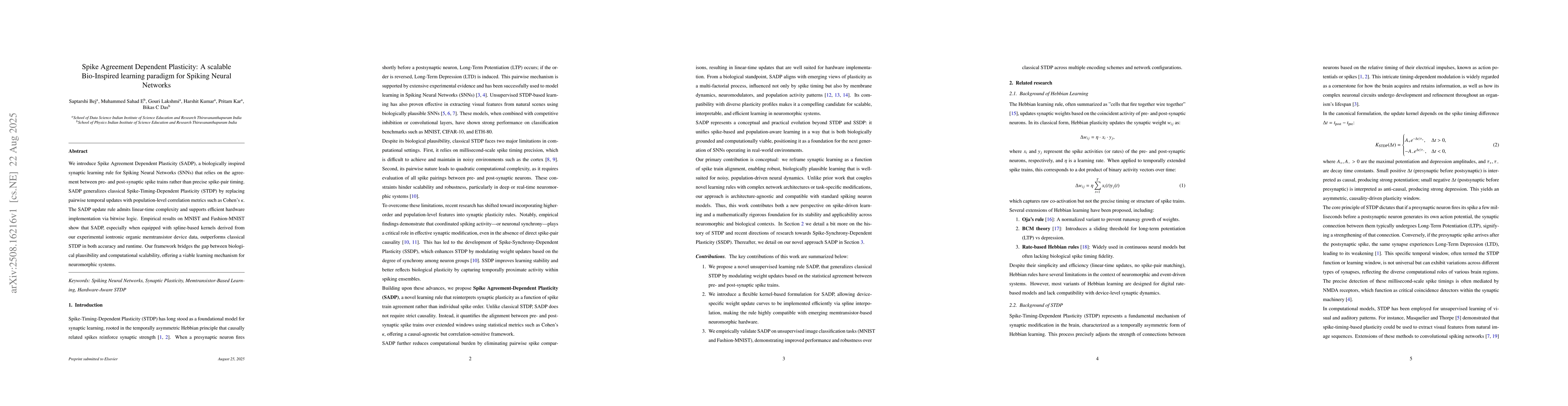 We introduce Spike Agreement Dependent Plasticity (SADP), a biologically inspired synaptic learning rule for Spiking Neural Networks (SNNs) that relies on the agreement between pre- and post-synaptic spike trains rather than precise spike-pair timing. SADP generalizes classical Spike-Timing-Dependent Plasticity (STDP) by replacing pairwise temporal updates with population-level correlation metrics such as Cohen's kappa. The SADP update rule admits linear-time complexity and supports efficient hardware implementation via bitwise logic. Empirical results on MNIST and Fashion-MNIST show that SADP, especially when equipped with spline-based kernels derived from our experimental iontronic organic memtransistor device data, outperforms classical STDP in both accuracy and runtime. Our framework bridges the gap between biological plausibility and computational scalability, offering a viable learning mechanism for neuromorphic systems.