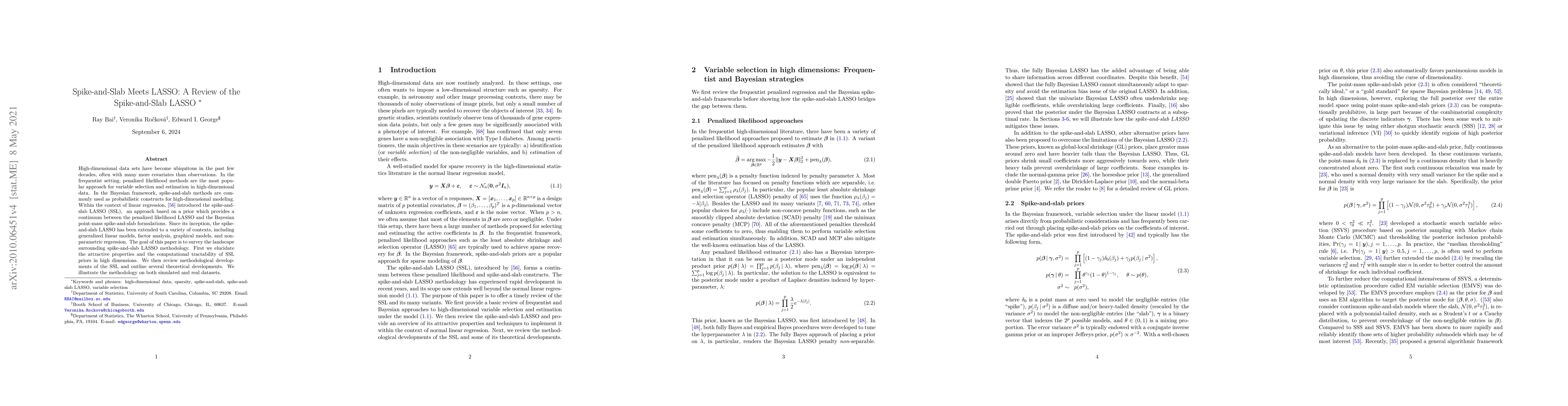 This paper reviews the spike-and-slab LASSO (SSL) methodology, highlighting its properties and computational advantages for high-dimensional data. It surveys methodological and theoretical developments and demonstrates its application through simulations and real datasets.