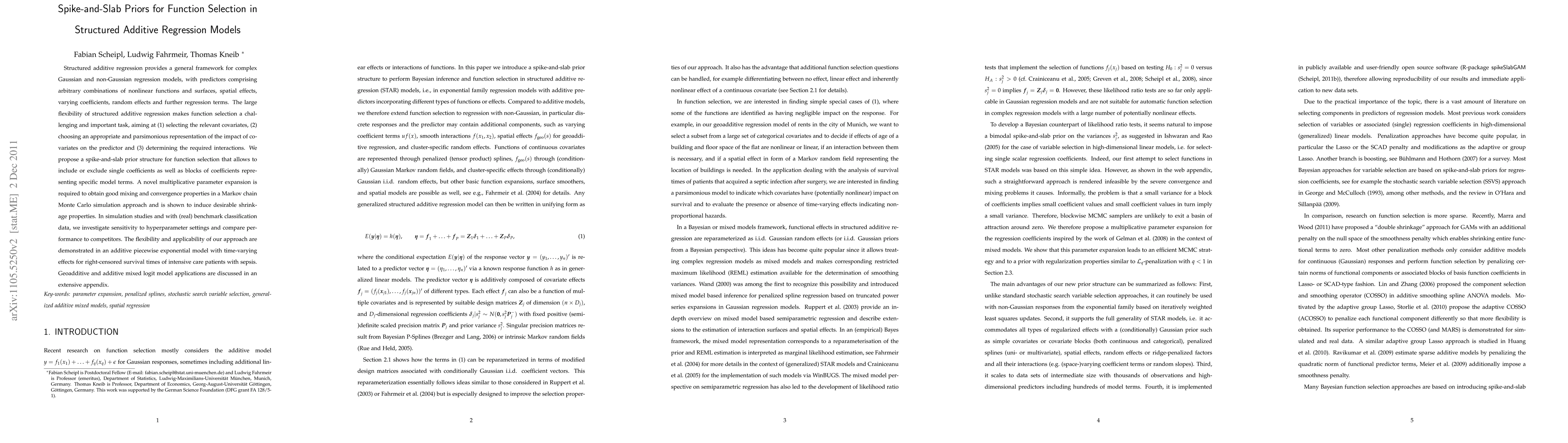 This paper introduces a novel approach to function selection in structured additive regression models using spike-and-slab priors, demonstrating improved performance and flexibility in various applications.