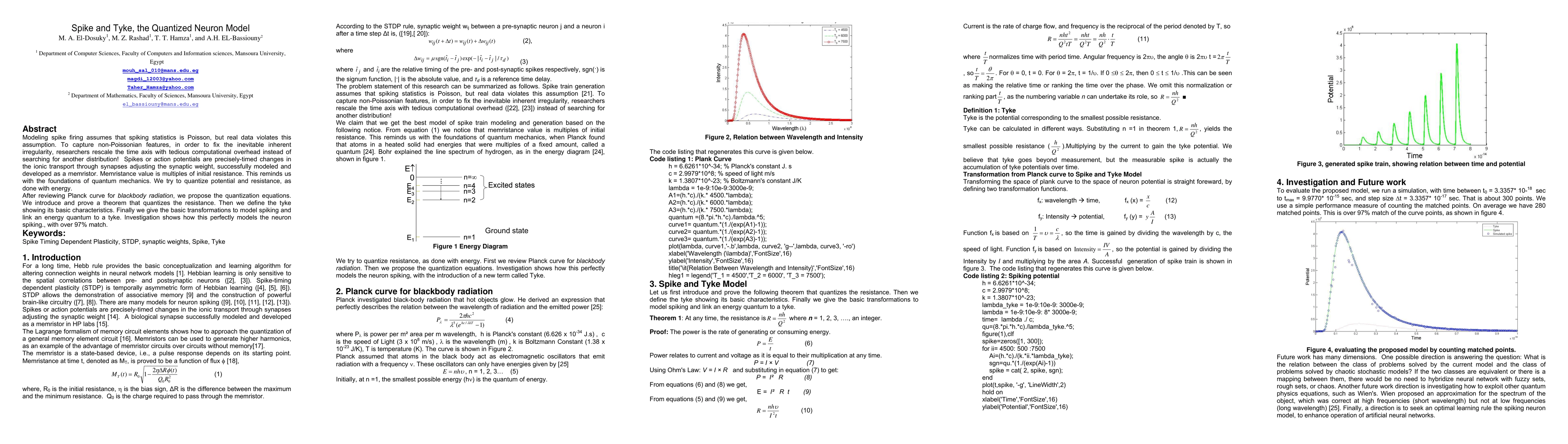 Modeling spike firing assumes that spiking statistics are Poisson, but real data violates this assumption. To capture non-Poissonian features, in order to fix the inevitable inherent irregularity, researchers rescale the time axis with tedious computational overhead instead of searching for another distribution. Spikes or action potentials are precisely-timed changes in the ionic transport through synapses adjusting the synaptic weight, successfully modeled and developed as a memristor. Memristance value is multiples of initial resistance. This reminds us with the foundations of quantum mechanics. We try to quantize potential and resistance, as done with energy. After reviewing Planck curve for blackbody radiation, we propose the quantization equations. We introduce and prove a theorem that quantizes the resistance. Then we define the tyke showing its basic characteristics. Finally we give the basic transformations to model spiking and link an energy quantum to a tyke. Investigation shows how this perfectly models the neuron spiking, with over 97% match.