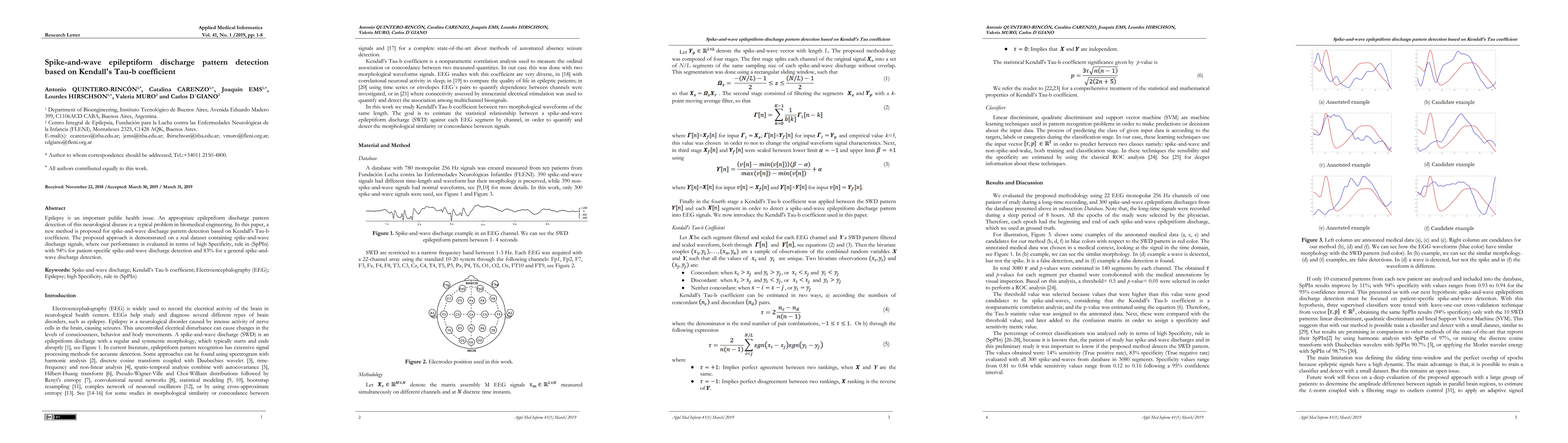 This paper proposes a novel method for detecting spike-and-wave discharge patterns in epilepsy using Kendall's Tau-b coefficient, achieving high specificity and rule-in performance of 94% for patient-specific detection and 83% for general detection.