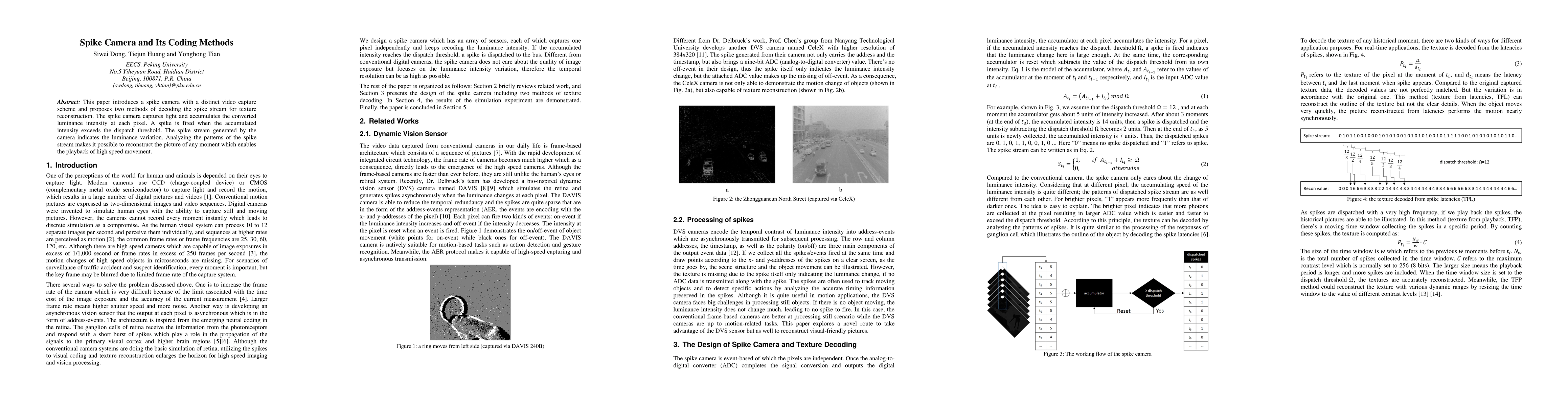 This paper introduces a spike camera that captures light and encodes luminance intensity variations as spike streams, proposing two decoding methods for texture reconstruction and enabling high-speed movement playback.