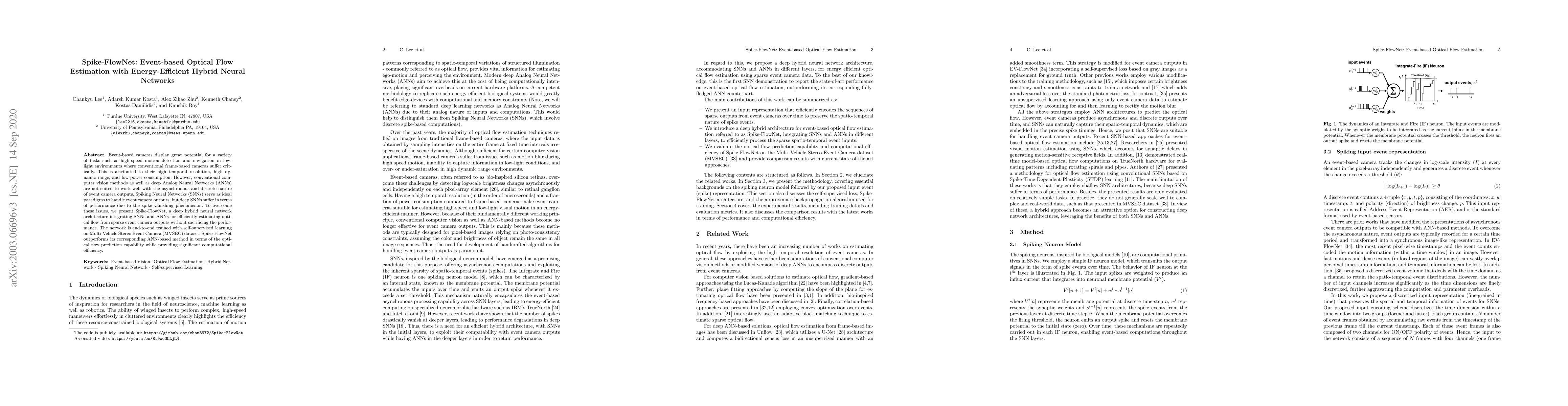Spike-FlowNet combines Spiking Neural Networks (SNNs) and Analog Neural Networks (ANNs) to efficiently estimate optical flow from event camera data, achieving better performance than ANN-based methods while maintaining computational efficiency. The hybrid architecture is trained self-supervised on the MVSEC dataset.