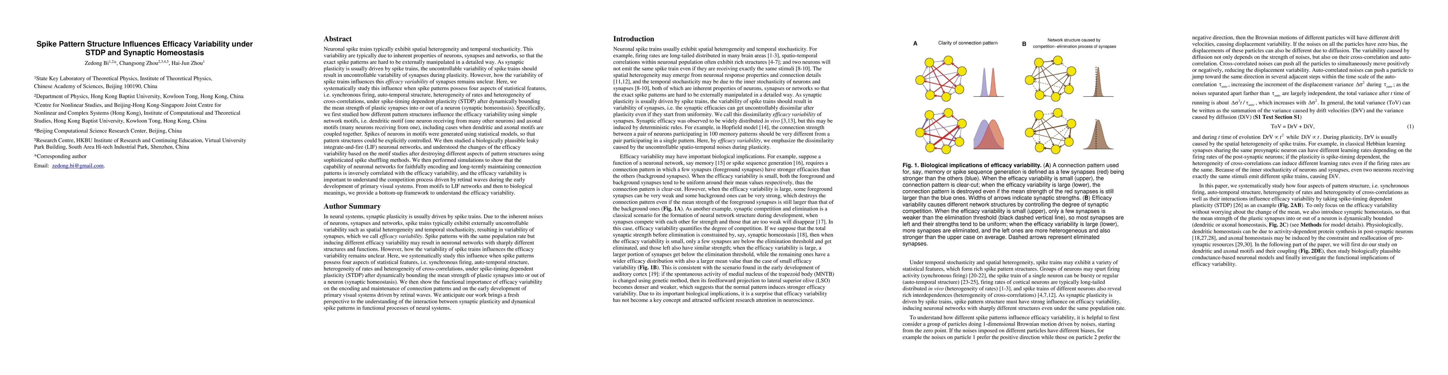 This paper investigates how different statistical features of spike patterns influence synaptic efficacy variability under spike-timing dependent plasticity and synaptic homeostasis. It finds that variability in spike patterns affects the structure and function of neural networks, highlighting the importance of efficacy variability in encoding and maintaining connection patterns, particularly in early visual system development.
