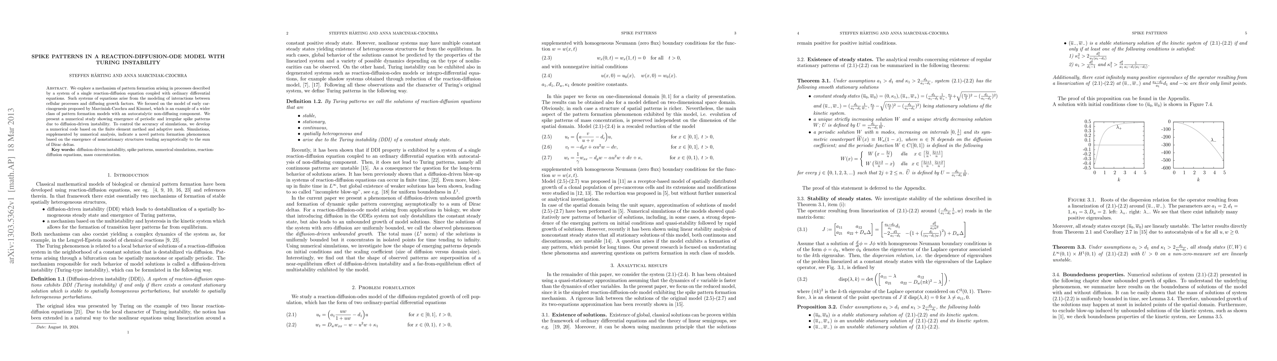 We explore a mechanism of pattern formation arising in processes described by a system of a single reaction-diffusion equation coupled with ordinary differential equations. Such systems of equations arise from the modeling of interactions between cellular processes and diffusing growth factors. We focused on the model of early carcinogenesis proposed by Marciniak-Czochra and Kimmel, which is an example of a wider class of pattern formation models with an autocatalytic non-diffusing component. We present a numerical study showing emergence of periodic and irregular spike patterns due to diffusion-driven instability. To control the accuracy of simulations, we develop a numerical code based on the finite element method and adaptive mesh. Simulations, supplemented by numerical analysis, indicate a novel pattern formation phenomenon based on the emergence of nonstationary structures tending asymptotically to the sum of Dirac deltas.