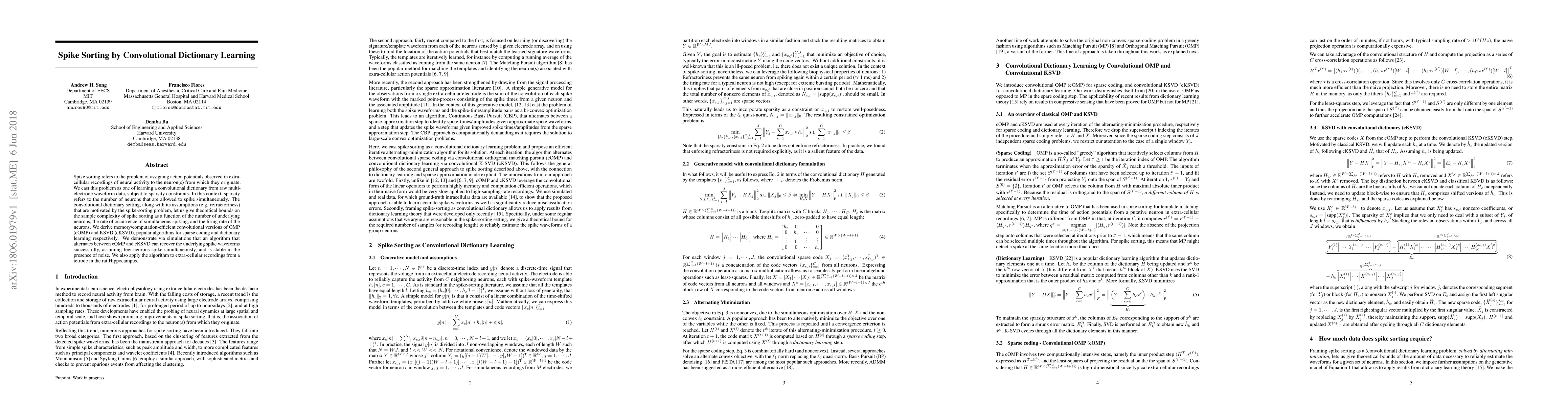 This paper proposes a convolutional dictionary learning approach for spike sorting in neural recordings, developing efficient algorithms cOMP and cKSVD to identify neuron firing patterns. Simulation and real-data experiments show successful recovery of spike waveforms under low simultaneous spiking and noise conditions.