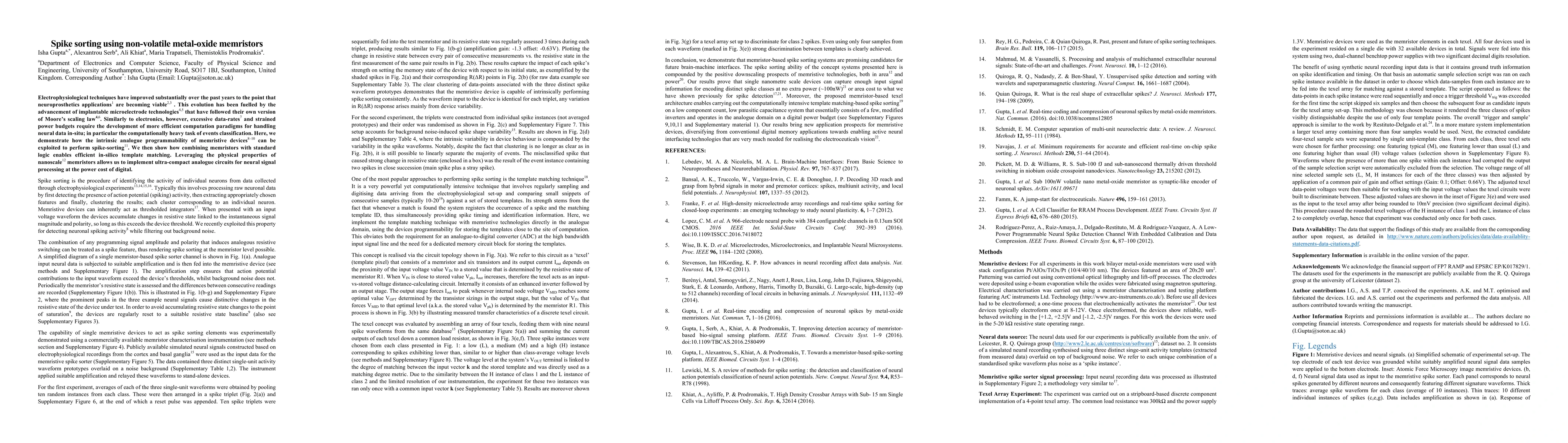 This paper explores the use of non-volatile metal-oxide memristors for efficient spike sorting in neuroprosthetics, leveraging their analogue programmability to perform event classification. The integration of memristors with standard logic enables compact, low-power in-silico template matching for neural signal processing.