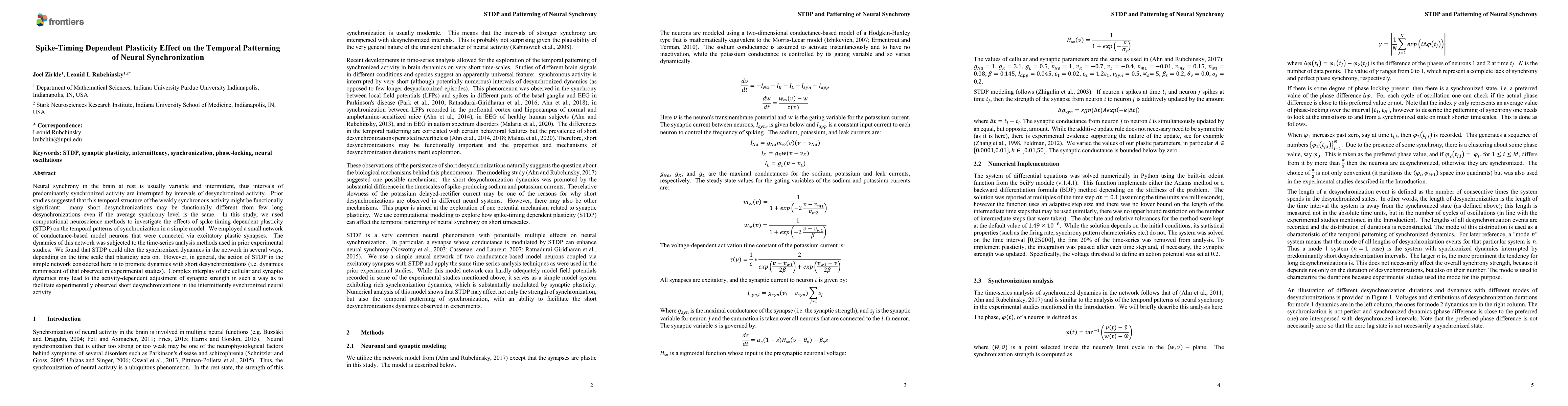 This study uses computational neuroscience to explore how spike-timing dependent plasticity (STDP) influences the temporal patterns of neural synchronization in a simple network model. The findings suggest that STDP tends to promote short desynchronizations, aligning with observed experimental patterns of intermittent neural synchrony.