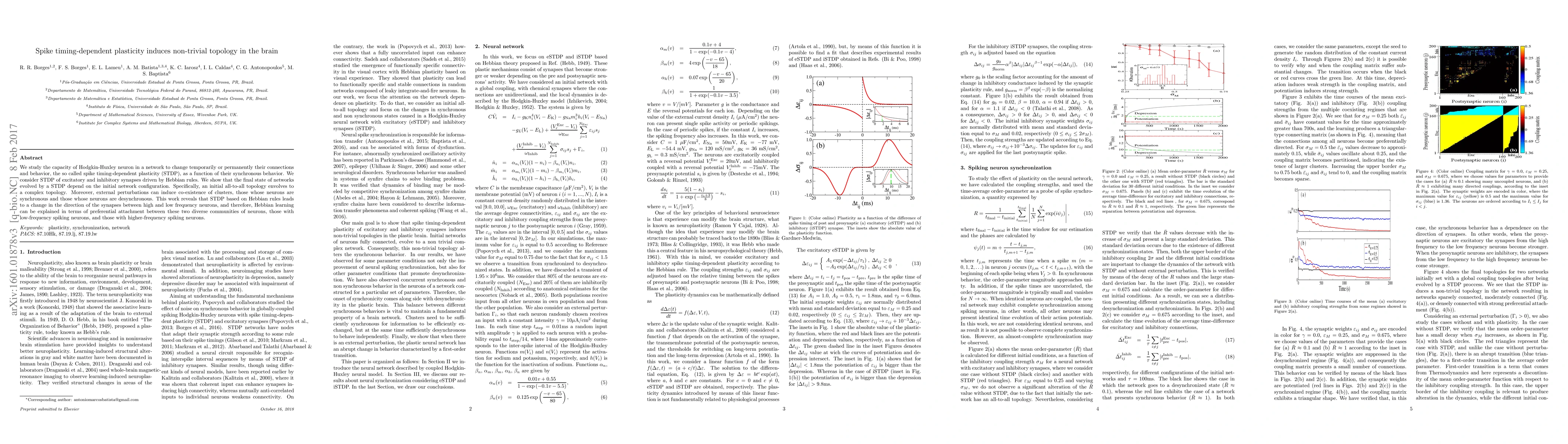 This research demonstrates that spike timing-dependent plasticity (STDP) in Hodgkin-Huxley neurons leads to complex network topologies, transforming initial all-to-all connections into intricate structures. The study reveals that external perturbations can create clusters of synchronous and desynchronous neurons, highlighting STDP's role in explaining Hebbian learning through preferential attachment between low- and high-frequency spiking neuron communities.