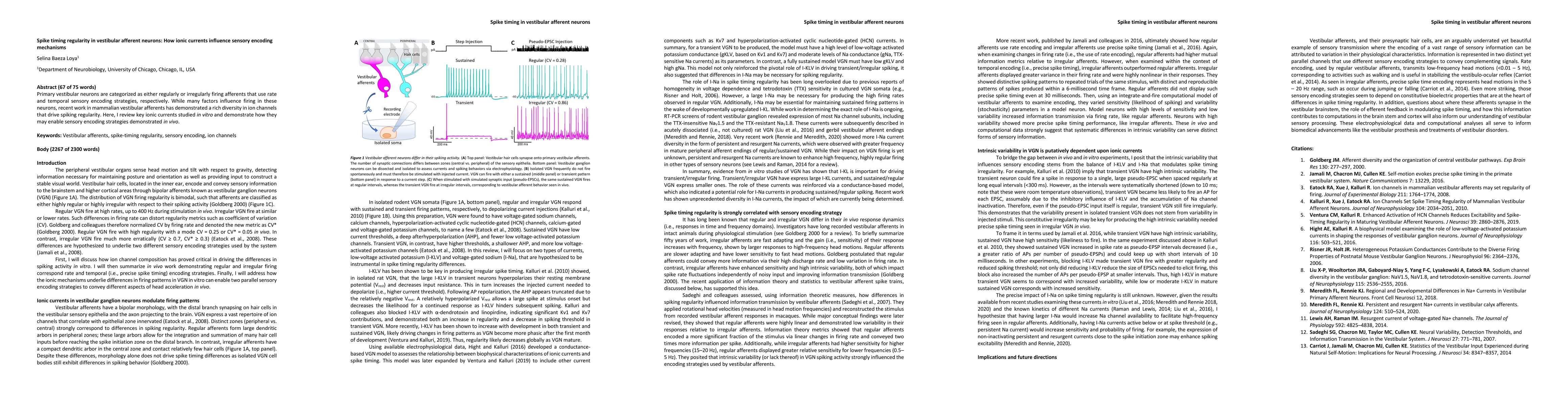 Primary vestibular neurons are categorized as either regularly or irregularly firing afferents that use rate and temporal sensory encoding strategies, respectively. While many factors influence firing in these neurons, recent work in mammalian vestibular afferents has demonstrated a rich diversity in ion channels that drive spiking regularity. Here, I review key ionic currents studied in vitro and demonstrate how they may enable sensory encoding strategies demonstrated in vivo.