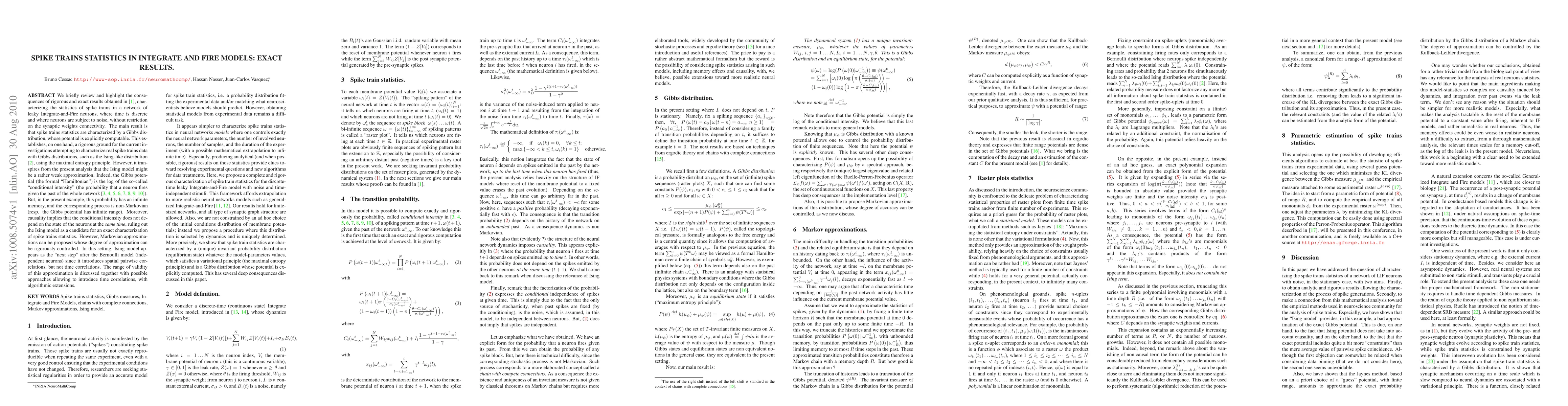 We briefly review and highlight the consequences of rigorous and exact results obtained in \cite{cessac:10}, characterizing the statistics of spike trains in a network of leaky Integrate-and-Fire neurons, where time is discrete and where neurons are subject to noise, without restriction on the synaptic weights connectivity. The main result is that spike trains statistics are characterized by a Gibbs distribution, whose potential is explicitly computable. This establishes, on one hand, a rigorous ground for the current investigations attempting to characterize real spike trains data with Gibbs distributions, such as the Ising-like distribution, using the maximal entropy principle. However, it transpires from the present analysis that the Ising model might be a rather weak approximation. Indeed, the Gibbs potential (the formal "Hamiltonian") is the log of the so-called "conditional intensity" (the probability that a neuron fires given the past of the whole network). But, in the present example, this probability has an infinite memory, and the corresponding process is non-Markovian (resp. the Gibbs potential has infinite range). Moreover, causality implies that the conditional intensity does not depend on the state of the neurons at the \textit{same time}, ruling out the Ising model as a candidate for an exact characterization of spike trains statistics. However, Markovian approximations can be proposed whose degree of approximation can be rigorously controlled. In this setting, Ising model appears as the "next step" after the Bernoulli model (independent neurons) since it introduces spatial pairwise correlations, but not time correlations. The range of validity of this approximation is discussed together with possible approaches allowing to introduce time correlations, with algorithmic extensions.