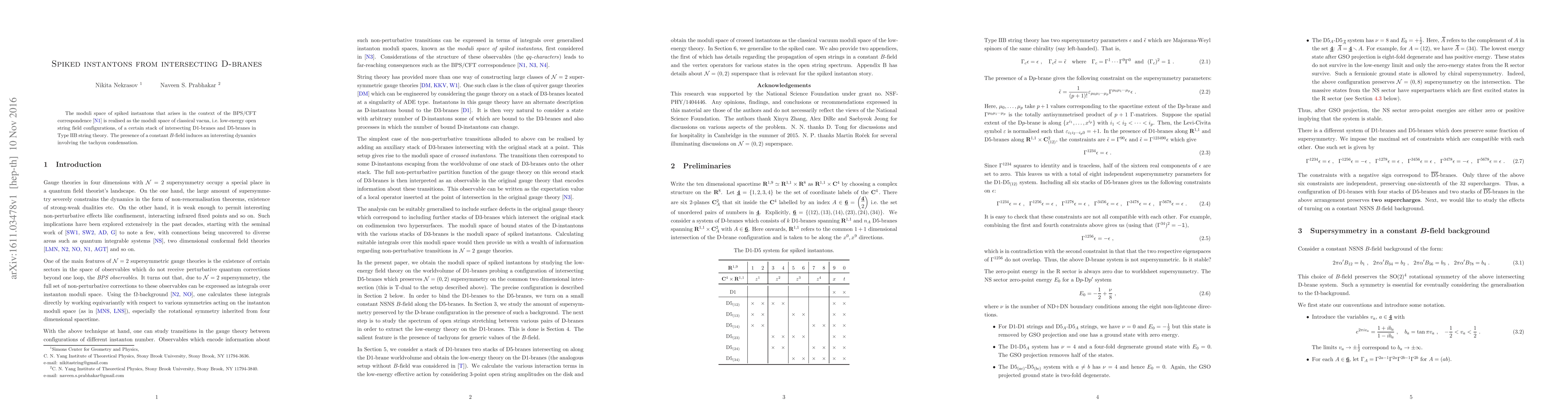 This paper explores the moduli space of spiked instantons in Type IIB string theory, showing they correspond to classical vacua of intersecting D1-branes and D5-branes. The dynamics, influenced by a constant B-field, involve tachyon condensation.