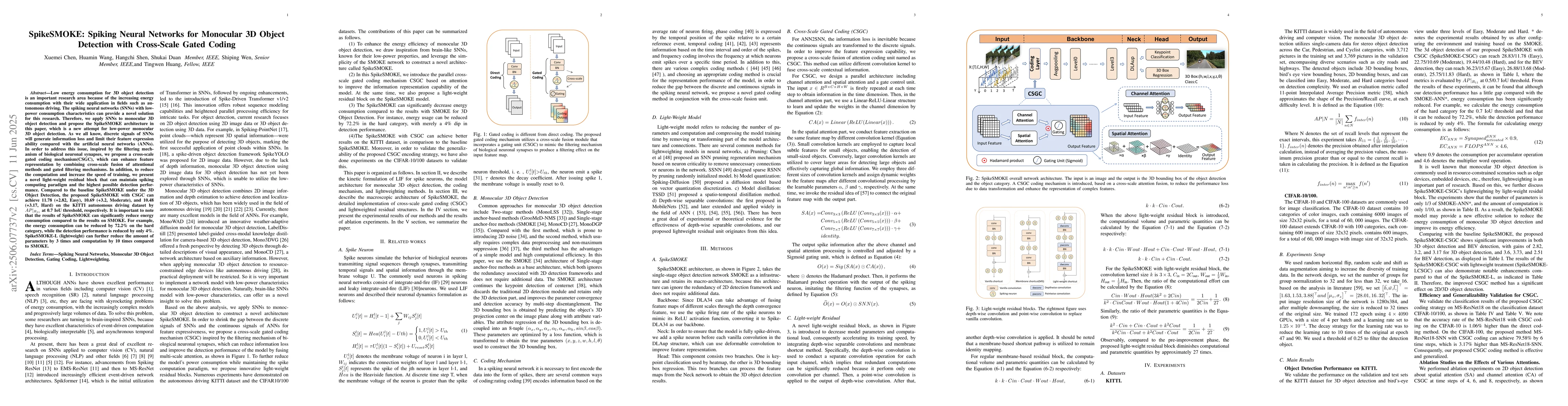 Low energy consumption for 3D object detection is an important research area because of the increasing energy consumption with their wide application in fields such as autonomous driving. The spiking neural networks (SNNs) with low-power consumption characteristics can provide a novel solution for this research. Therefore, we apply SNNs to monocular 3D object detection and propose the SpikeSMOKE architecture in this paper, which is a new attempt for low-power monocular 3D object detection. As we all know, discrete signals of SNNs will generate information loss and limit their feature expression ability compared with the artificial neural networks (ANNs).In order to address this issue, inspired by the filtering mechanism of biological neuronal synapses, we propose a cross-scale gated coding mechanism(CSGC), which can enhance feature representation by combining cross-scale fusion of attentional methods and gated filtering mechanisms.In addition, to reduce the computation and increase the speed of training, we present a novel light-weight residual block that can maintain spiking computing paradigm and the highest possible detection performance. Compared to the baseline SpikeSMOKE under the 3D Object Detection, the proposed SpikeSMOKE with CSGC can achieve 11.78 (+2.82, Easy), 10.69 (+3.2, Moderate), and 10.48 (+3.17, Hard) on the KITTI autonomous driving dataset by AP|R11 at 0.7 IoU threshold, respectively. It is important to note that the results of SpikeSMOKE can significantly reduce energy consumption compared to the results on SMOKE. For example,the energy consumption can be reduced by 72.2% on the hard category, while the detection performance is reduced by only 4%. SpikeSMOKE-L (lightweight) can further reduce the amount of parameters by 3 times and computation by 10 times compared to SMOKE.