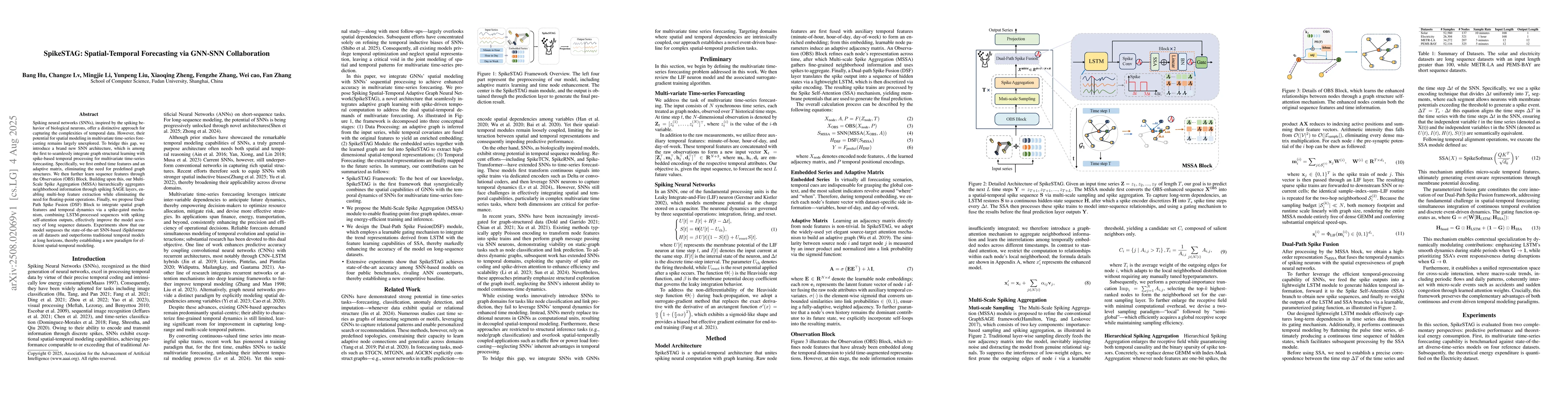 Spiking neural networks (SNNs), inspired by the spiking behavior of biological neurons, offer a distinctive approach for capturing the complexities of temporal data. However, their potential for spatial modeling in multivariate time-series forecasting remains largely unexplored. To bridge this gap, we introduce a brand new SNN architecture, which is among the first to seamlessly integrate graph structural learning with spike-based temporal processing for multivariate time-series forecasting. Specifically, we first embed time features and an adaptive matrix, eliminating the need for predefined graph structures. We then further learn sequence features through the Observation (OBS) Block. Building upon this, our Multi-Scale Spike Aggregation (MSSA) hierarchically aggregates neighborhood information through spiking SAGE layers, enabling multi-hop feature extraction while eliminating the need for floating-point operations. Finally, we propose a Dual-Path Spike Fusion (DSF) Block to integrate spatial graph features and temporal dynamics via a spike-gated mechanism, combining LSTM-processed sequences with spiking self-attention outputs, effectively improve the model accuracy of long sequence datasets. Experiments show that our model surpasses the state-of-the-art SNN-based iSpikformer on all datasets and outperforms traditional temporal models at long horizons, thereby establishing a new paradigm for efficient spatial-temporal modeling.