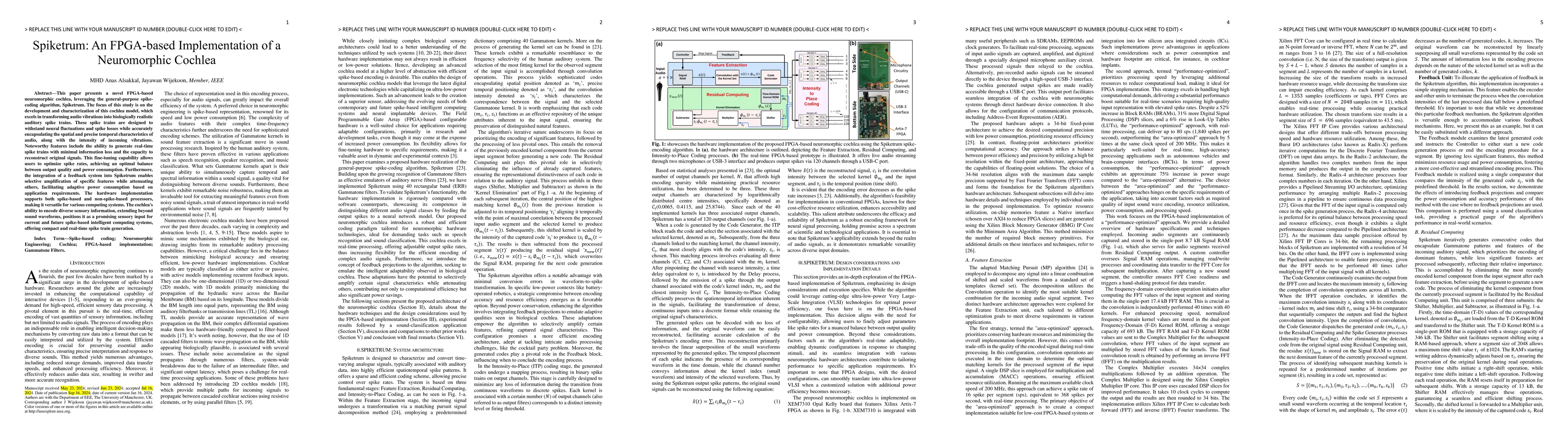 This paper introduces Spiketrum, an FPGA-based neuromorphic cochlea that transforms audio vibrations into biologically realistic spike trains, maintaining temporal and spatial audio details with minimal loss. The system supports real-time signal reconstruction and adaptable power consumption through a feedback mechanism.