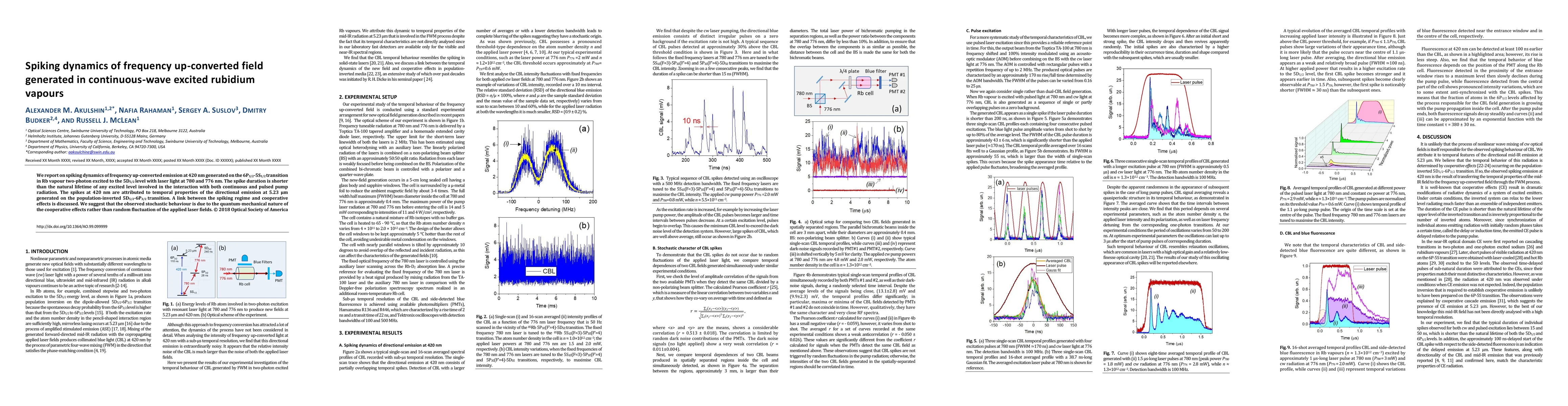 This paper investigates the spiking dynamics of frequency up-converted 420 nm emission in rubidium vapours, attributing the observed spikes to the temporal properties of directional emission at 5.23 μm. The study suggests that the stochastic spiking behavior is due to quantum-mechanical cooperative effects rather than random fluctuations in laser fields.