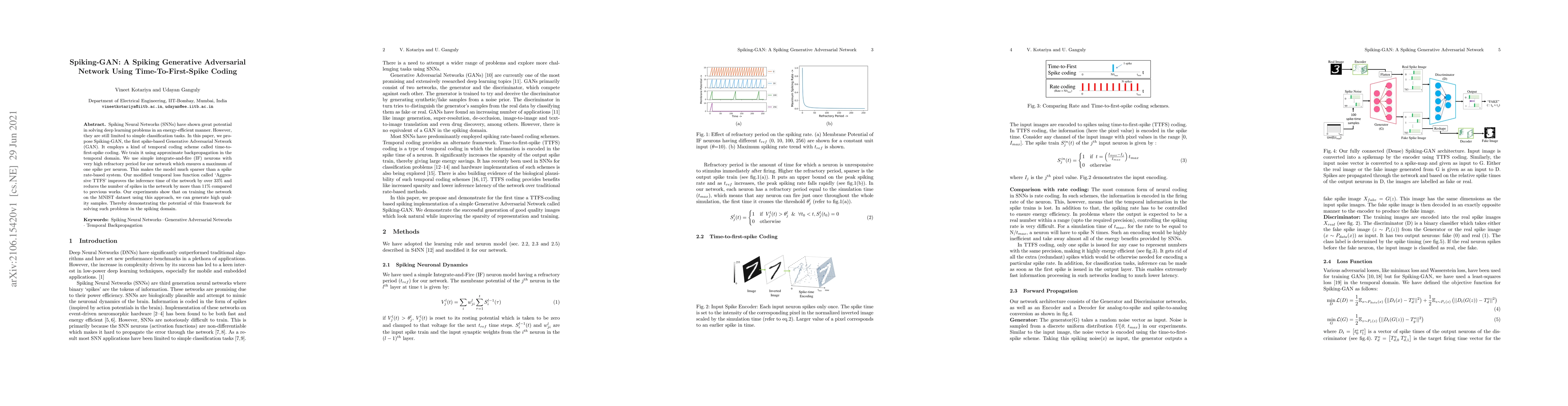 Spiking Neural Networks (SNNs) have shown great potential in solving deep learning problems in an energy-efficient manner. However, they are still limited to simple classification tasks. In this paper, we propose Spiking-GAN, the first spike-based Generative Adversarial Network (GAN). It employs a kind of temporal coding scheme called time-to-first-spike coding. We train it using approximate backpropagation in the temporal domain. We use simple integrate-and-fire (IF) neurons with very high refractory period for our network which ensures a maximum of one spike per neuron. This makes the model much sparser than a spike rate-based system. Our modified temporal loss function called 'Aggressive TTFS' improves the inference time of the network by over 33% and reduces the number of spikes in the network by more than 11% compared to previous works. Our experiments show that on training the network on the MNIST dataset using this approach, we can generate high quality samples. Thereby demonstrating the potential of this framework for solving such problems in the spiking domain.