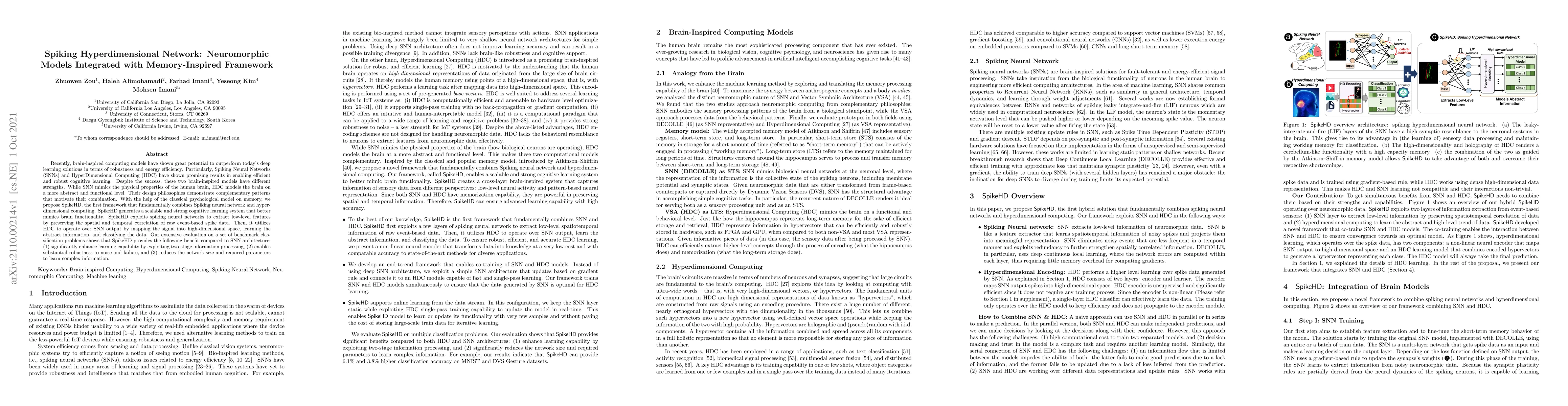 Recently, brain-inspired computing models have shown great potential to outperform today's deep learning solutions in terms of robustness and energy efficiency. Particularly, Spiking Neural Networks (SNNs) and HyperDimensional Computing (HDC) have shown promising results in enabling efficient and robust cognitive learning. Despite the success, these two brain-inspired models have different strengths. While SNN mimics the physical properties of the human brain, HDC models the brain on a more abstract and functional level. Their design philosophies demonstrate complementary patterns that motivate their combination. With the help of the classical psychological model on memory, we propose SpikeHD, the first framework that fundamentally combines Spiking neural network and hyperdimensional computing. SpikeHD generates a scalable and strong cognitive learning system that better mimics brain functionality. SpikeHD exploits spiking neural networks to extract low-level features by preserving the spatial and temporal correlation of raw event-based spike data. Then, it utilizes HDC to operate over SNN output by mapping the signal into high-dimensional space, learning the abstract information, and classifying the data. Our extensive evaluation on a set of benchmark classification problems shows that SpikeHD provides the following benefit compared to SNN architecture: (1) significantly enhance learning capability by exploiting two-stage information processing, (2) enables substantial robustness to noise and failure, and (3) reduces the network size and required parameters to learn complex information.