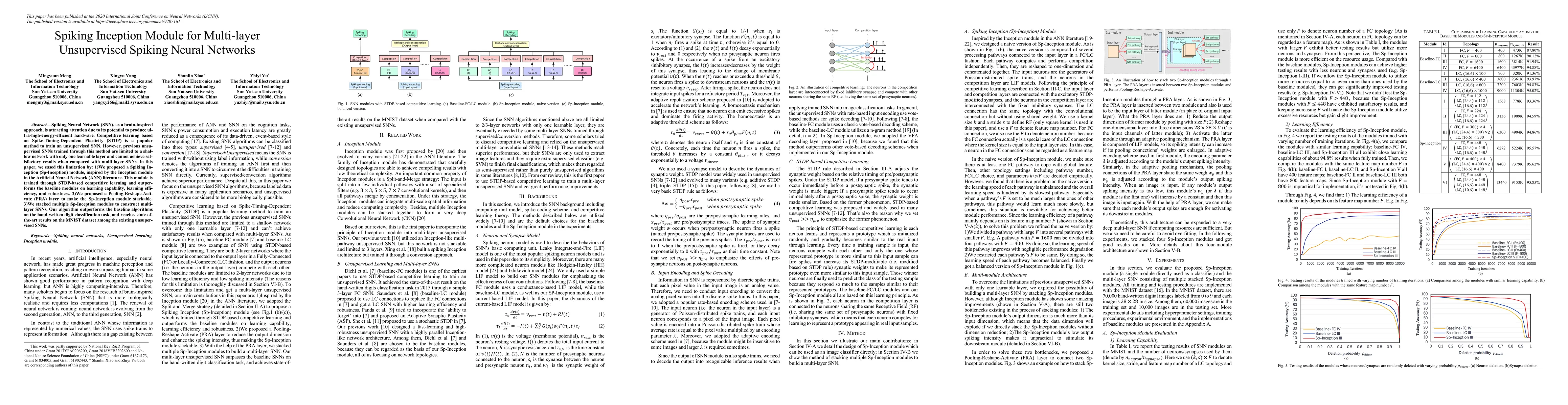 This paper proposes a Spiking Inception module and a Pooling-Reshape-Activate (PRA) layer to enable multi-layer unsupervised Spiking Neural Networks (SNNs) trained via Spike-Timing-Dependent Plasticity (STDP). The approach achieves state-of-the-art results on the MNIST dataset for hand-written digit classification.