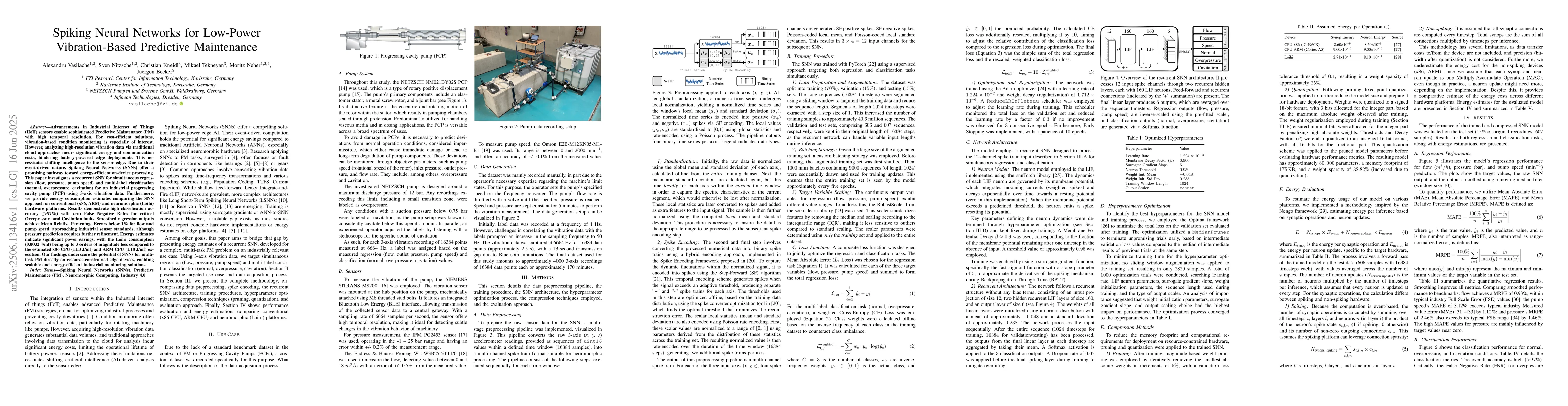 This research employs a recurrent Spiking Neural Network (SNN) for low-power, vibration-based predictive maintenance of a progressing cavity pump (PCP). The SNN is trained to perform simultaneous regression of flow, pressure, and pump speed, as well as classification of pump conditions (normal, overpressure, cavitation). The model is optimized using PyTorch with a composite loss function and pruned/quantized for deployment on resource-constrained hardware.