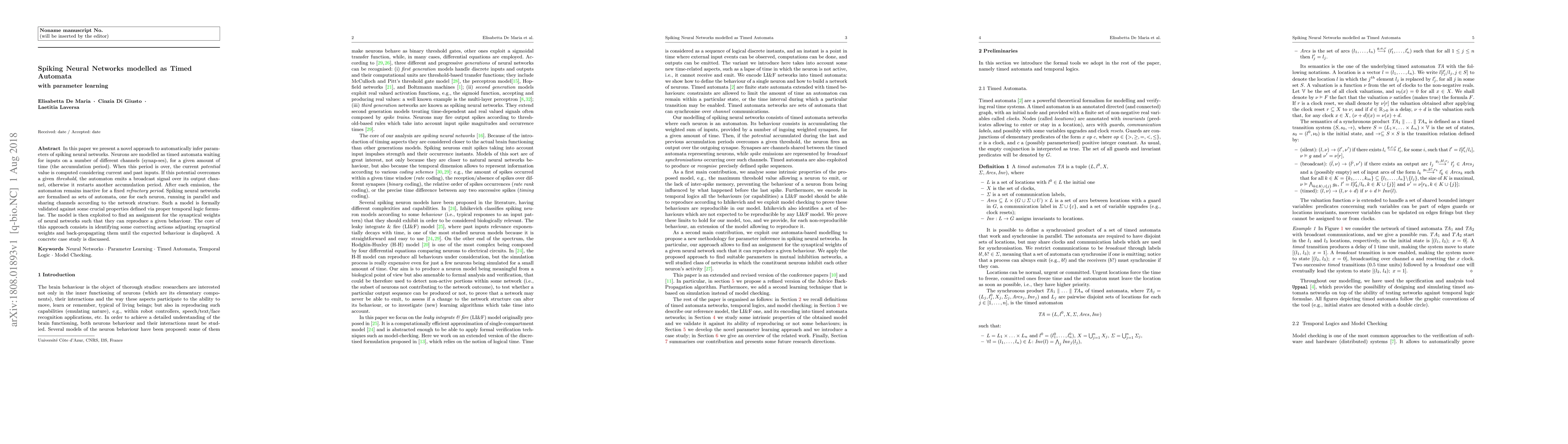 In this paper we present a novel approach to automatically infer parameters of spiking neural networks. Neurons are modelled as timed automata waiting for inputs on a number of different channels (synapses), for a given amount of time (the accumulation period). When this period is over, the current potential value is computed considering current and past inputs. If this potential overcomes a given threshold, the automaton emits a broadcast signal over its output channel , otherwise it restarts another accumulation period. After each emission, the automaton remains inactive for a fixed refractory period. Spiking neural networks are formalised as sets of automata, one for each neuron, running in parallel and sharing channels according to the network structure. Such a model is formally validated against some crucial properties defined via proper temporal logic formulae. The model is then exploited to find an assignment for the synaptical weights of neural networks such that they can reproduce a given behaviour. The core of this approach consists in identifying some correcting actions adjusting synaptical weights and back-propagating them until the expected behaviour is displayed. A concrete case study is discussed.