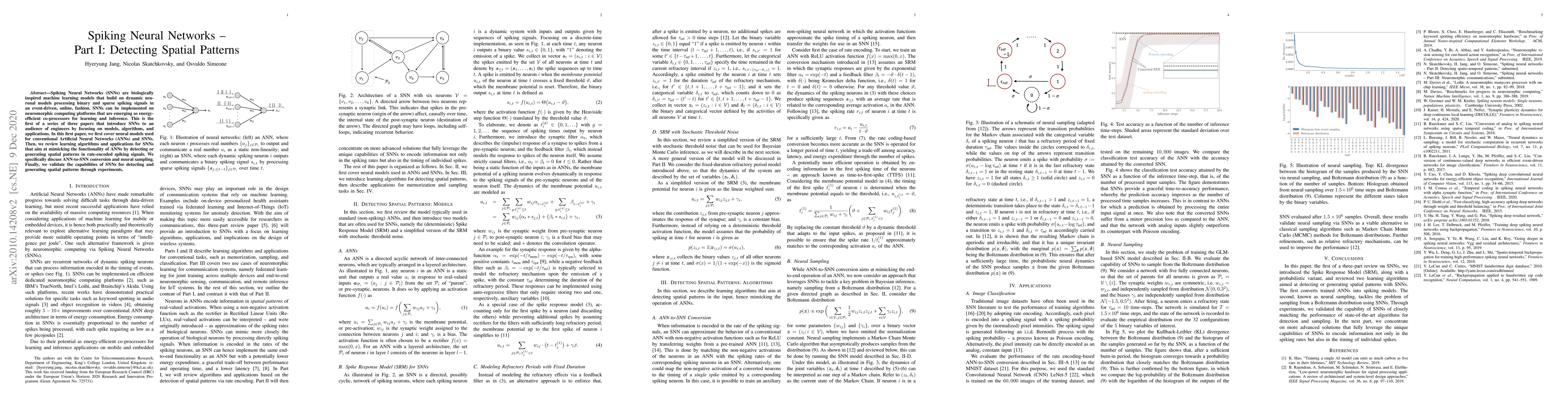 Spiking Neural Networks (SNNs) are biologically inspired machine learning models that build on dynamic neuronal models processing binary and sparse spiking signals in an event-driven, online, fashion. SNNs can be implemented on neuromorphic computing platforms that are emerging as energy-efficient co-processors for learning and inference. This is the first of a series of three papers that introduce SNNs to an audience of engineers by focusing on models, algorithms, and applications. In this first paper, we first cover neural models used for conventional Artificial Neural Networks (ANNs) and SNNs. Then, we review learning algorithms and applications for SNNs that aim at mimicking the functionality of ANNs by detecting or generating spatial patterns in rate-encoded spiking signals. We specifically discuss ANN-to-SNN conversion and neural sampling. Finally, we validate the capabilities of SNNs for detecting and generating spatial patterns through experiments.