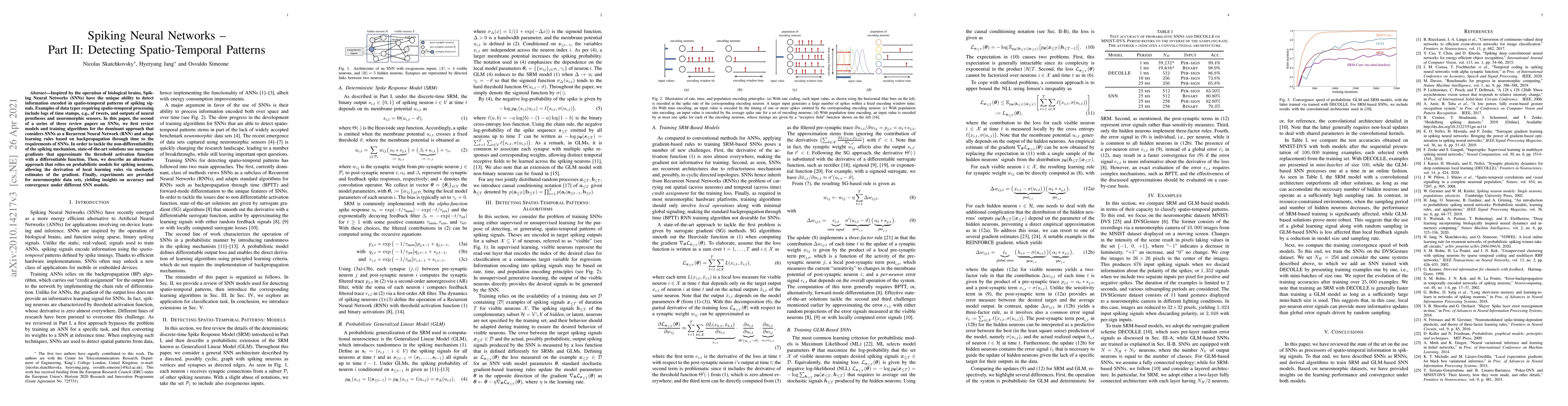 This paper reviews two main approaches to training Spiking Neural Networks (SNNs) for spatio-temporal pattern detection: adapting RNN-based backpropagation through time and using probabilistic models with local learning rules. Experiments on neuromorphic data sets evaluate their accuracy and convergence.