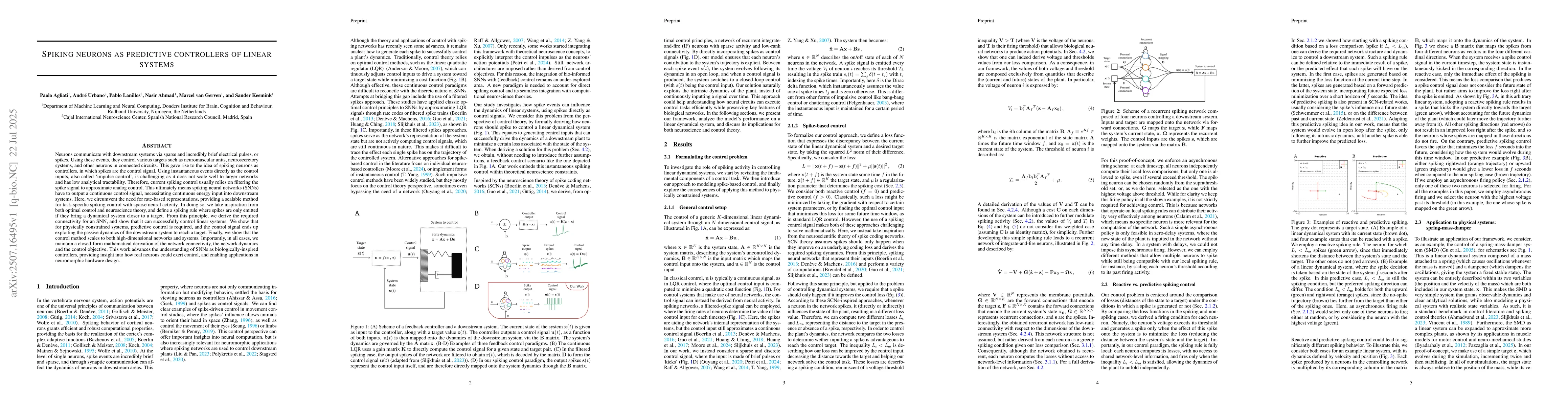 This work introduces a new paradigm for spiking control that differs from existing methods, such as spike coding networks and neural predictive control.