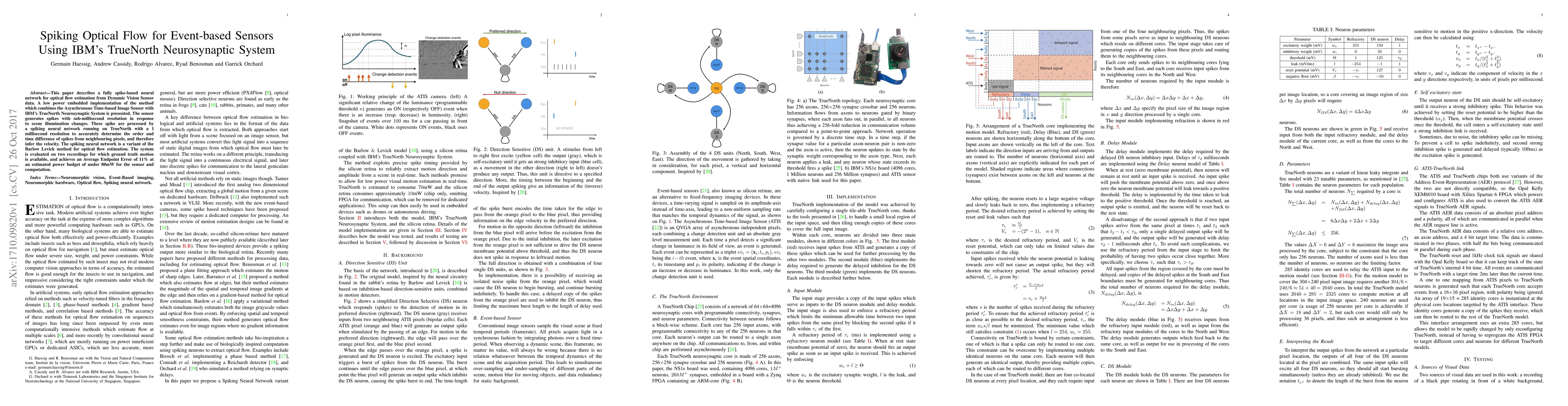 This paper proposes a low-power spiking neural network for optical flow estimation using event-based sensors and IBM's TrueNorth neurosynaptic system, achieving an 11% Average Endpoint Error with an estimated power consumption of under 80mW. The method leverages sub-millisecond spike resolution from the sensor to infer pixel velocity.