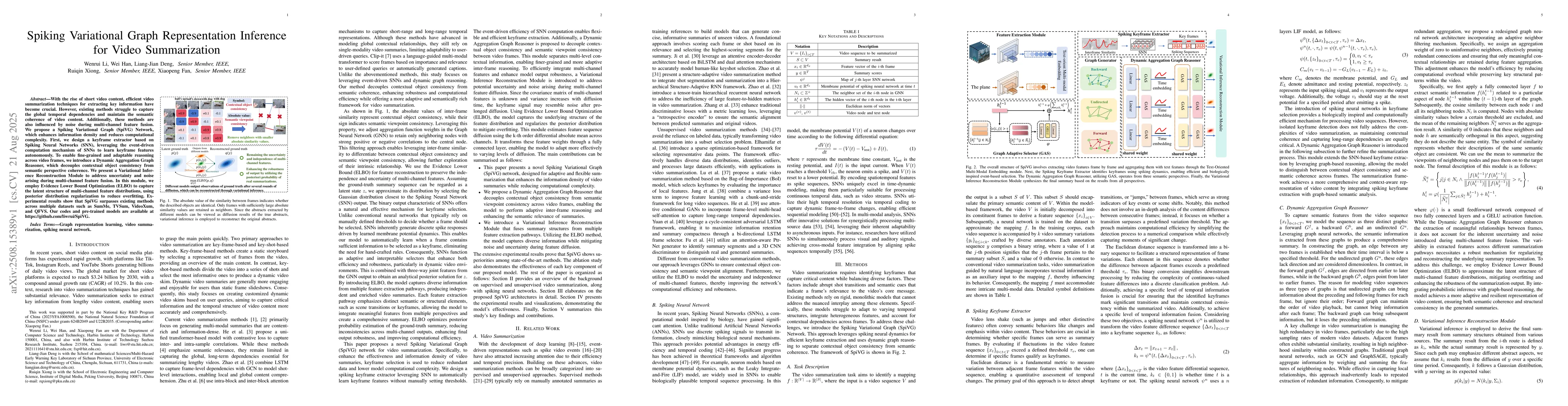 With the rise of short video content, efficient video summarization techniques for extracting key information have become crucial. However, existing methods struggle to capture the global temporal dependencies and maintain the semantic coherence of video content. Additionally, these methods are also influenced by noise during multi-channel feature fusion. We propose a Spiking Variational Graph (SpiVG) Network, which enhances information density and reduces computational complexity. First, we design a keyframe extractor based on Spiking Neural Networks (SNN), leveraging the event-driven computation mechanism of SNNs to learn keyframe features autonomously. To enable fine-grained and adaptable reasoning across video frames, we introduce a Dynamic Aggregation Graph Reasoner, which decouples contextual object consistency from semantic perspective coherence. We present a Variational Inference Reconstruction Module to address uncertainty and noise arising during multi-channel feature fusion. In this module, we employ Evidence Lower Bound Optimization (ELBO) to capture the latent structure of multi-channel feature distributions, using posterior distribution regularization to reduce overfitting. Experimental results show that SpiVG surpasses existing methods across multiple datasets such as SumMe, TVSum, VideoXum, and QFVS. Our codes and pre-trained models are available at https://github.com/liwrui/SpiVG.