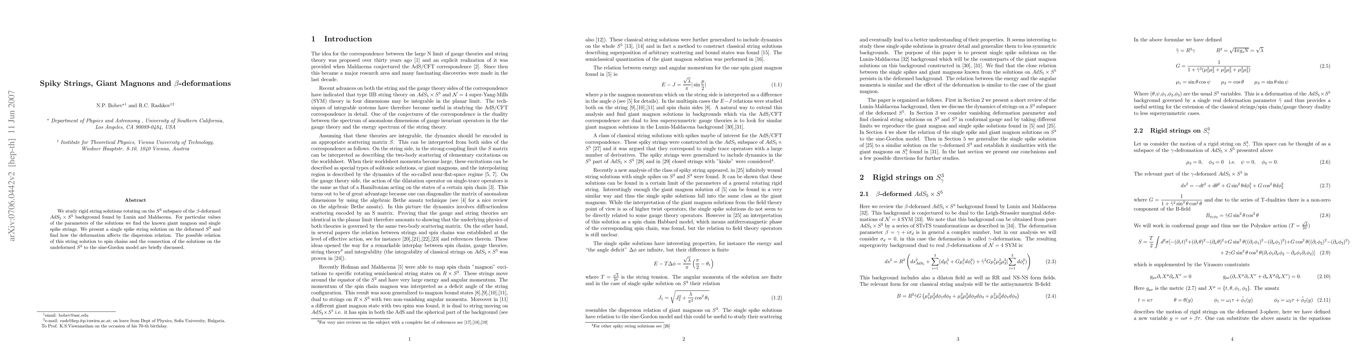 This paper investigates rigid rotating string solutions on the beta-deformed AdS_5xS^5 background, identifying giant magnon and single spike strings. It presents a detailed analysis of the deformation's impact on the dispersion relation and briefly explores connections to spin chains and the sine-Gordon model.