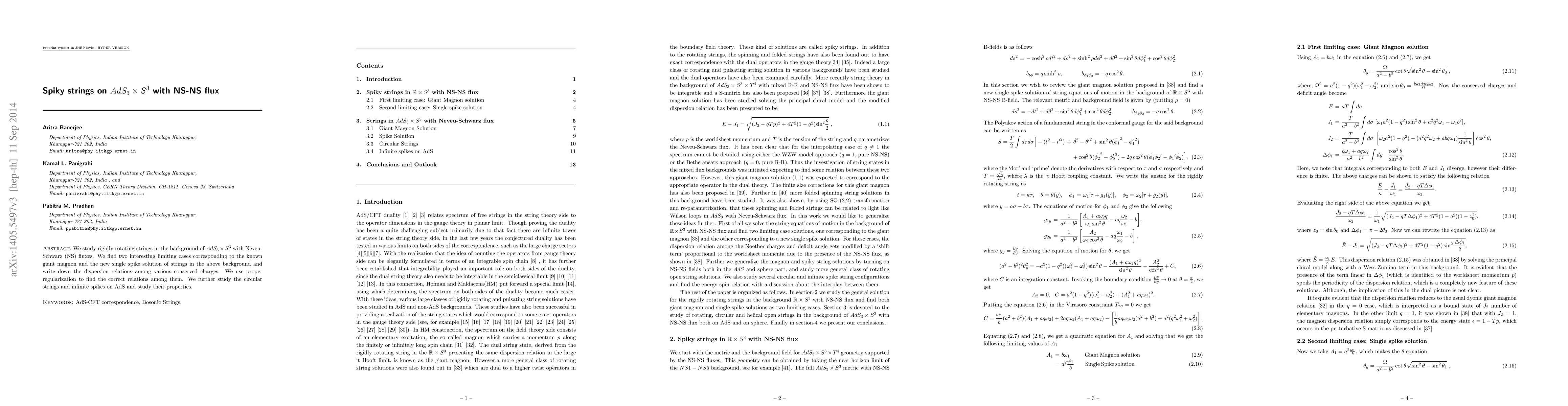 This paper investigates rigidly rotating strings in the AdS3 x S3 background with NS fluxes, identifying two notable solutions: the giant magnon and a new single spike solution. It derives the dispersion relations among conserved charges and examines the properties of circular and infinite spiky strings on AdS.