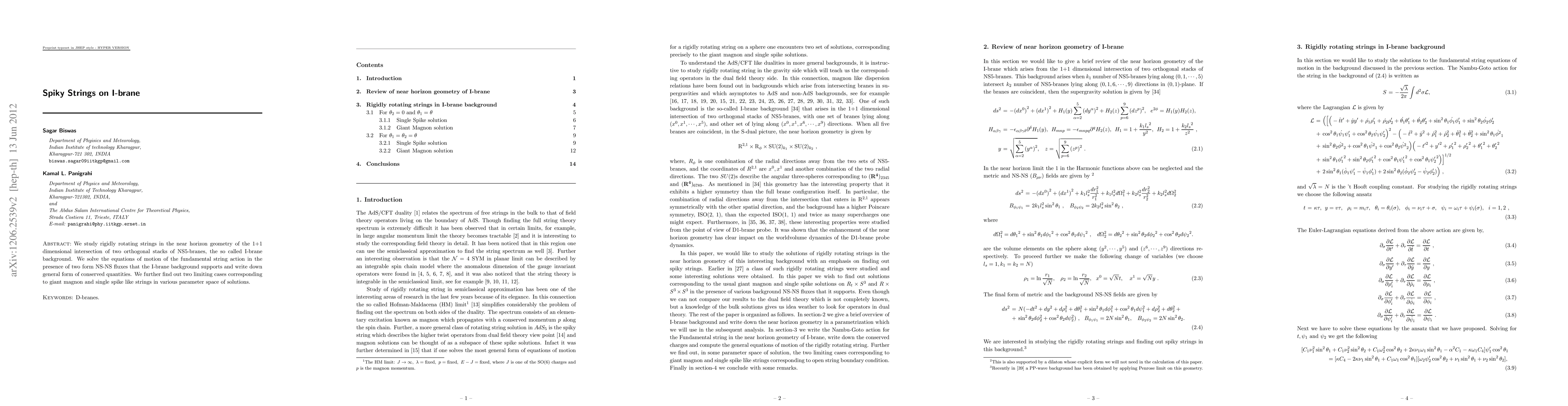 The paper presents detailed solutions for rigidly rotating strings in the I-brane background, including explicit forms of conserved quantities and dispersion relations for single spike and giant magnon solutions.