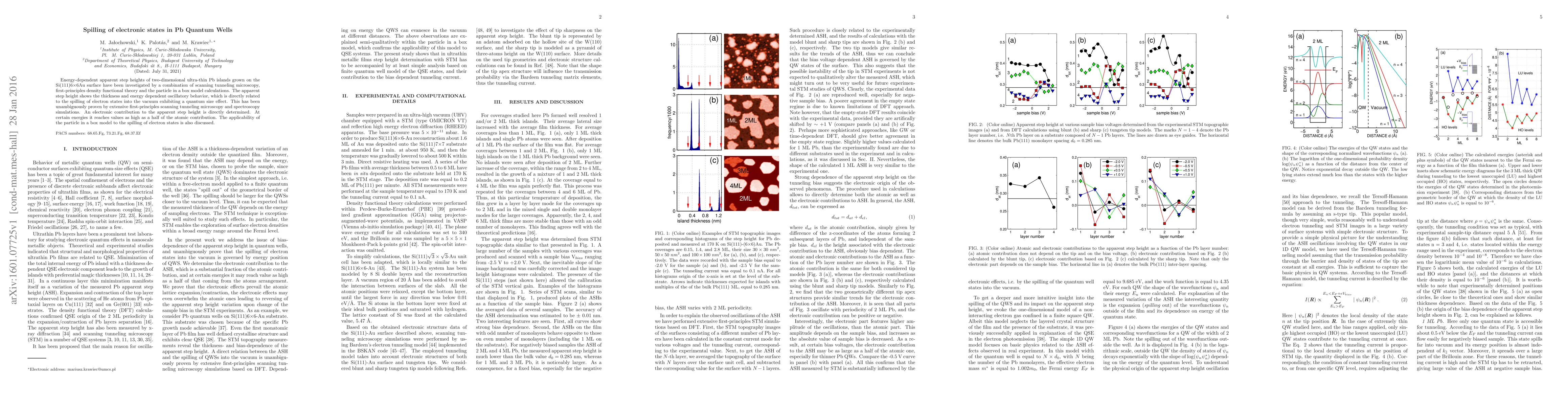 Energy-dependent apparent step heights of two-dimensional ultra-thin Pb islands grown on the Si(111)6$\times$6Au surface have been investigated by a combination of scanning tunneling microscopy, first-principles density functional theory and the particle in a box model calculations. The apparent step height shows the thickness and energy dependent oscillatory behavior, which is directly related to the spilling of electron states into the vacuum exhibiting a quantum size effect. This has been unambiguously proven by extensive first-principles scanning tunneling microscopy and spectroscopy simulations. An electronic contribution to the apparent step height is directly determined. At certain energies it reaches values as high as a half of the atomic contribution. The applicability of the particle in a box model to the spilling of electron states is also discussed.