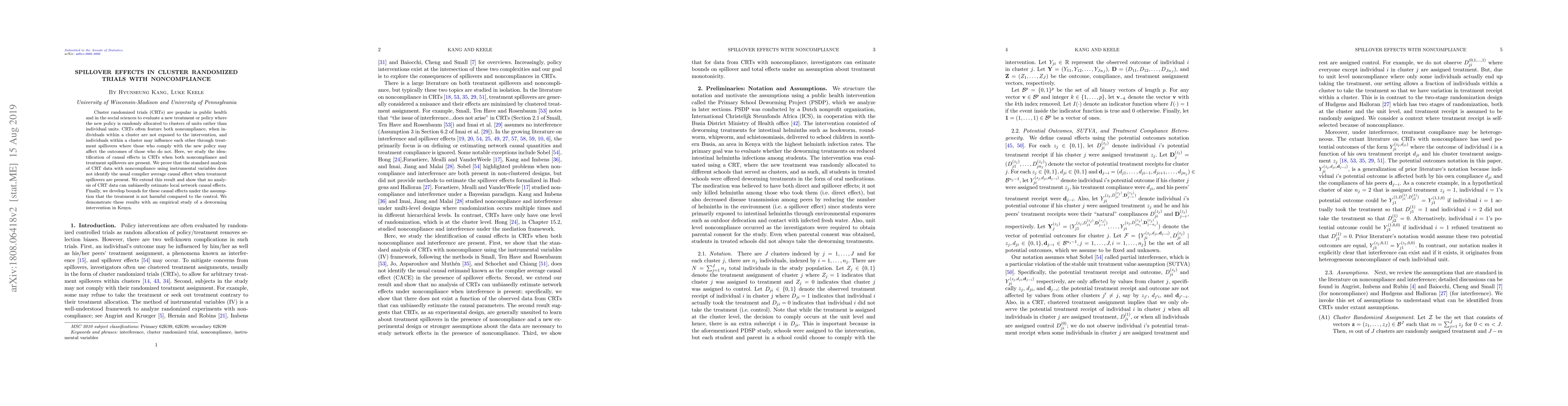 This paper examines the identification of causal effects in cluster randomized trials (CRTs) with both noncompliance and treatment spillovers, proving that standard methods fail to accurately estimate causal effects in such scenarios. It develops bounds for causal effects under non-harmful treatment conditions and demonstrates these findings through an empirical study on a deworming intervention in Kenya.
