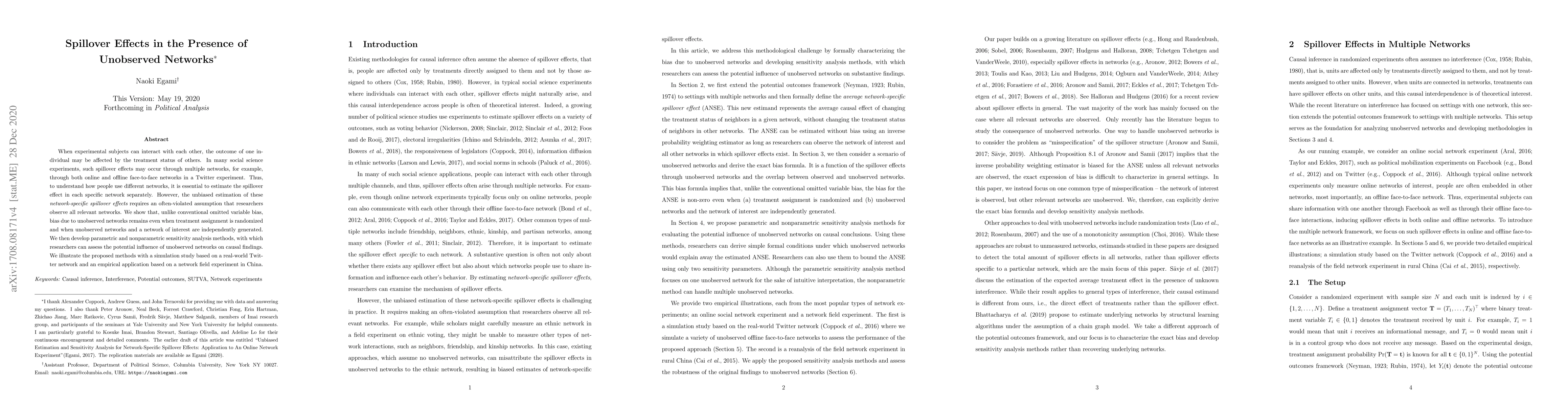 This paper investigates the spillover effects in social science experiments where subjects interact, emphasizing the challenge of unobserved networks. It develops methods to estimate network-specific spillover effects and assesses the influence of unobserved networks on causal findings through parametric and nonparametric sensitivity analyses, illustrated with a Twitter network simulation and a China-based field experiment.
