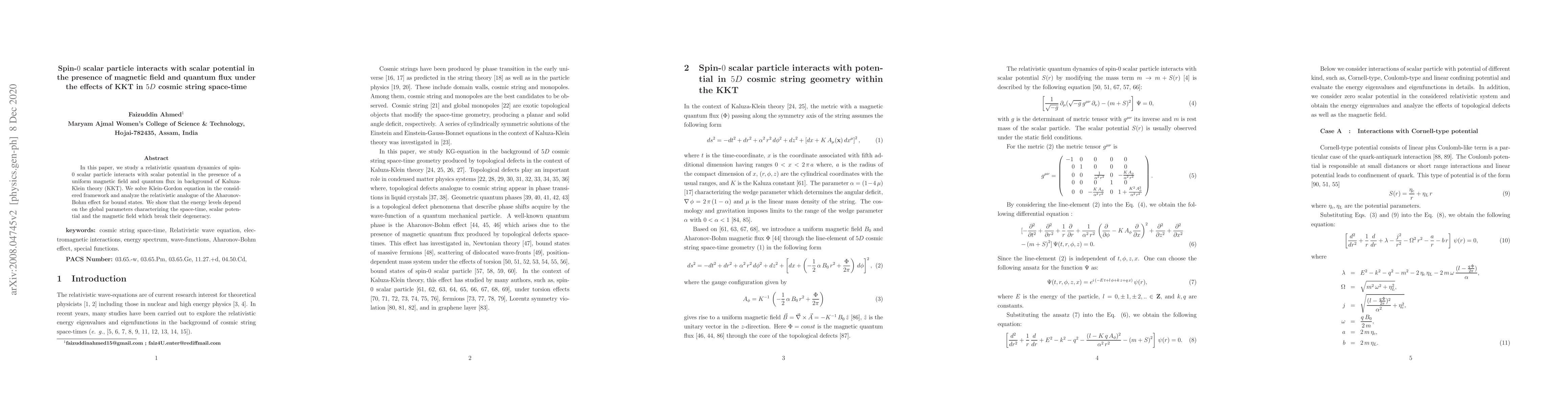This paper investigates the relativistic quantum dynamics of a spin-0 scalar particle interacting with a scalar potential in a 5D cosmic string space-time under the influence of a magnetic field and quantum flux, using the Kaluza-Klein theory. The study reveals that the energy levels of bound states are affected by the space-time parameters, scalar potential, and magnetic field, breaking their degeneracy.