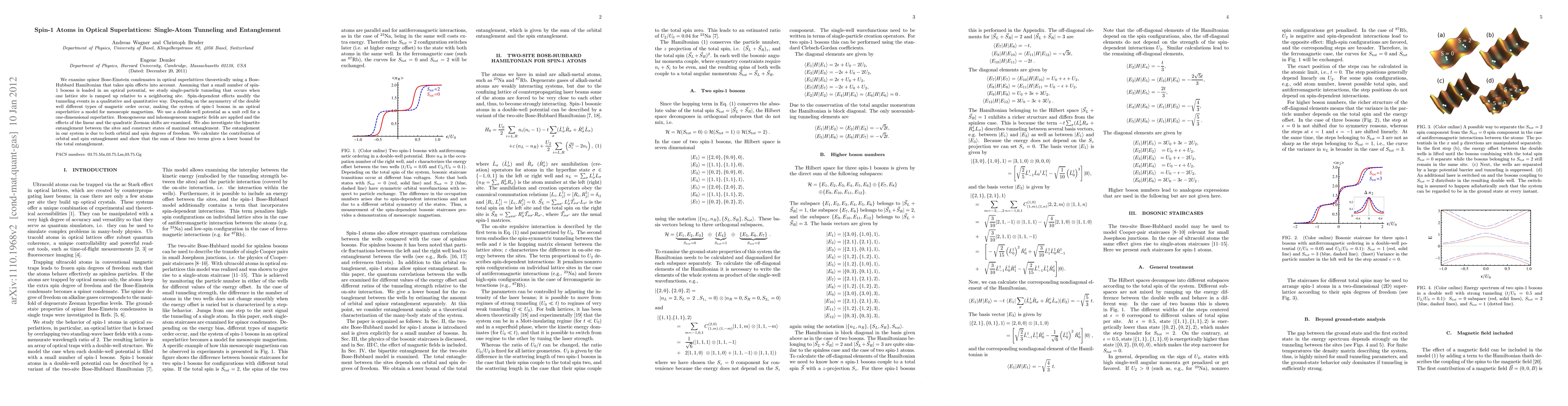 This paper theoretically explores spinor Bose-Einstein condensates in optical superlattices using a Bose-Hubbard model, focusing on single-atom tunneling and spin-dependent effects. It also investigates the bipartite entanglement between sites, showing that orbital and spin entanglement contribute to the total entanglement.