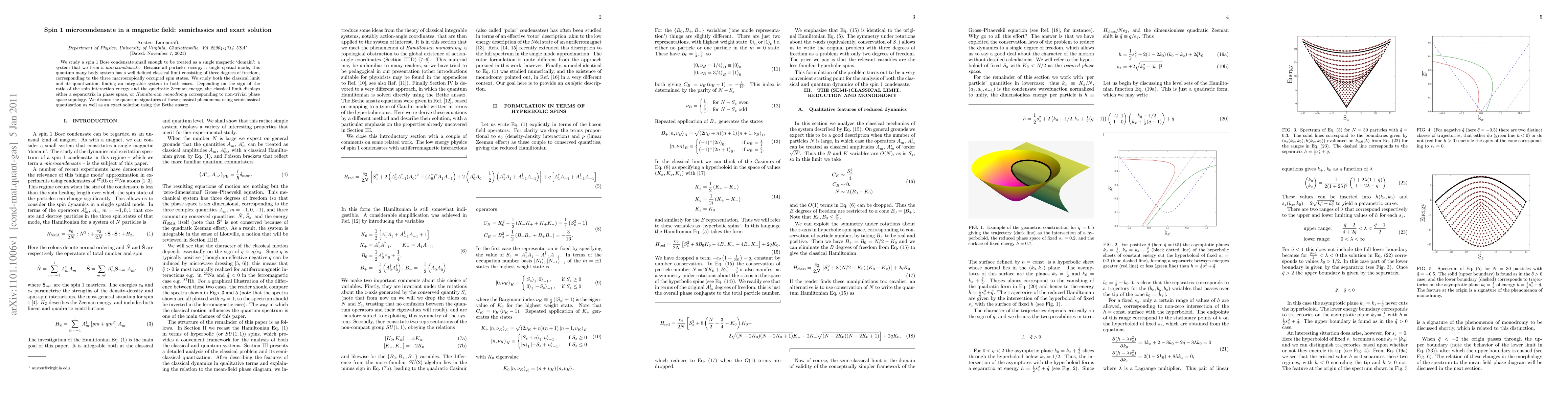 We study a spin 1 Bose condensate small enough to be treated as a single magnetic `domain': a system that we term a microcondensate. Because all particles occupy a single spatial mode, this quantum many body system has a well defined classical limit consisting of three degrees of freedom, corresponding to the three macroscopically occupied spin states. We study both the classical limit and its quantization, finding an integrable system in both cases. Depending on the sign of the ratio of the spin interaction energy and the quadratic Zeeman energy, the classical limit displays either a separartrix in phase space, or Hamiltonian monodromy corresponding to non-trivial phase space topology. We discuss the quantum signatures of these classical phenomena using semiclassical quantization as well as an exact solution using the Bethe ansatz.