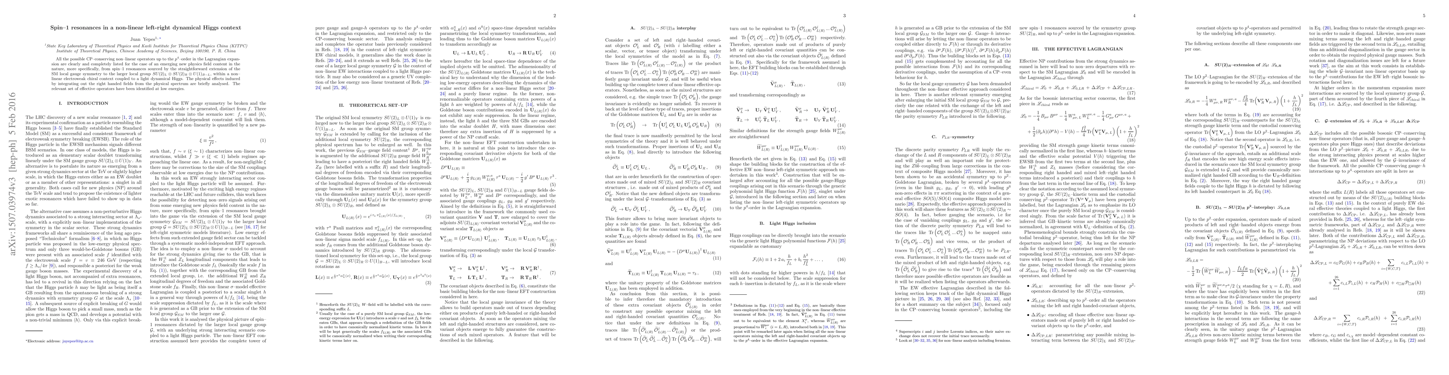 All the possible CP-conserving non-linear operators up to the $p^4$-order in the Lagrangian expansion are clearly and completely listed for the case of an emerging new physics field content in the nature, more specifically, from spin-1 resonances sourced by the straightforward extension of the SM local gauge symmetry to the larger local group $SU(2)_L\otimes SU(2)_R\otimes U(1)_{B-L}$, within a non-linear electroweak chiral context coupled to a light dynamical Higgs. The physical effects induced by integrating out the right handed fields from the physical spectrum are briefly analysed. The relevant set of effective operators have been identified at low energies.