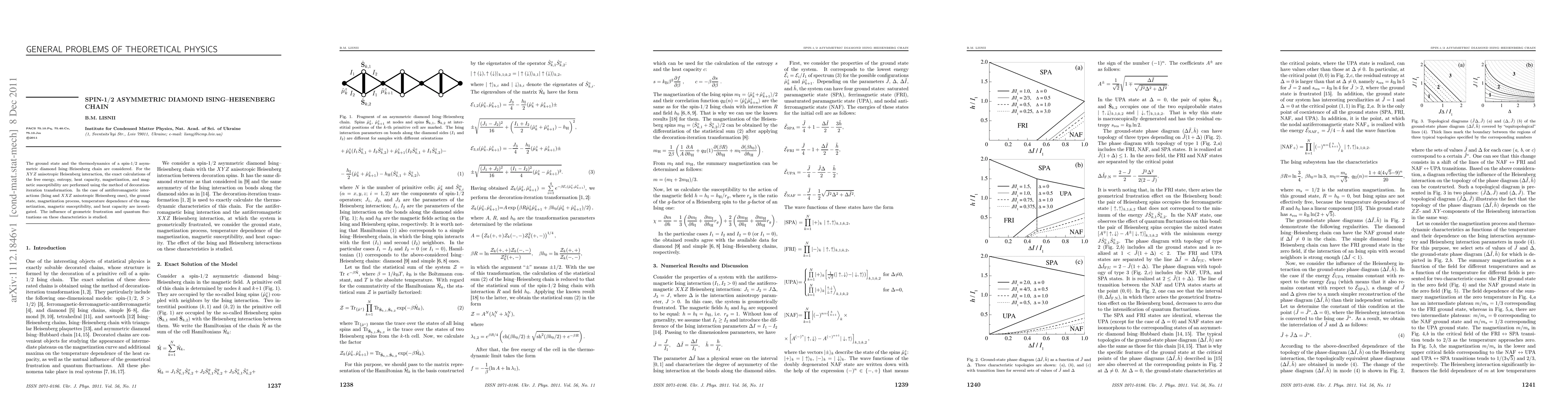 The ground state and the thermodynamics of a spin-1/2 asymmetric diamond Ising--Heisenberg chain are considered. For the $XYZ$ anisotropic Heisenberg interaction, the exact calculations of the free energy, entropy, heat capacity, magnetization, and magnetic susceptibility are performed using the method of decoration-iteration transformation. In the case of antiferromagnetic interactions (Ising and $XXZ$ anisotropic Heisenberg ones), the ground state, magnetization process, temperature dependence of the magnetization, magnetic susceptibility, and heat capacity are investigated. The influence of geometric frustration and quantum fluctuations on these characteristics is studied.