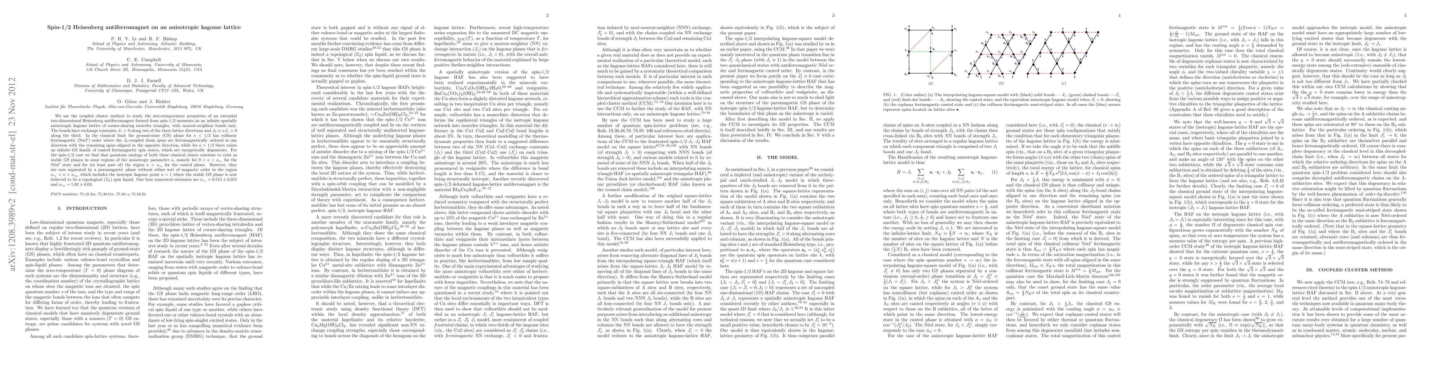 We use the coupled cluster method to study the zero-temperature properties of an extended two-dimensional Heisenberg antiferromagnet formed from spin-1/2 moments on an infinite spatially anisotropic kagome lattice of corner-sharing isosceles triangles, with nearest-neighbor bonds only. The bonds have exchange constants $J_{1}>0$ along two of the three lattice directions and $J_{2} \equiv \kappa J_{1} > 0$ along the third. In the classical limit the ground-state (GS) phase for $\kappa < 1/2$ has collinear ferrimagnetic (N\'{e}el$'$) order where the $J_2$-coupled chain spins are ferromagnetically ordered in one direction with the remaining spins aligned in the opposite direction, while for $\kappa > 1/2$ there exists an infinite GS family of canted ferrimagnetic spin states, which are energetically degenerate. For the spin-1/2 case we find that quantum analogs of both these classical states continue to exist as stable GS phases in some regions of the anisotropy parameter $\kappa$, namely for $0<\kappa<\kappa_{c_1}$ for the N\'{e}el$'$ state and for (at least part of) the region $\kappa>\kappa_{c_2}$ for the canted phase. However, they are now separated by a paramagnetic phase without either sort of magnetic order in the region $\kappa_{c_1} < \kappa < \kappa_{c_2}$, which includes the isotropic kagome point $\kappa = 1$ where the stable GS phase is now believed to be a topological ($\mathbb{Z}_2$) spin liquid. Our best numerical estimates are $\kappa_{c_1} = 0.515 \pm 0.015$ and $\kappa_{c_2} = 1.82 \pm 0.03$.