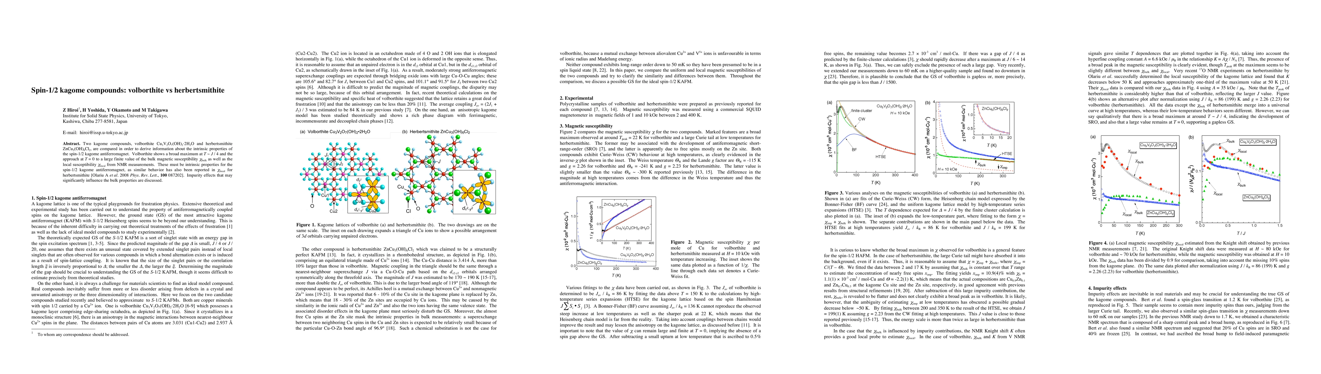 Two kagome compounds, volborthite Cu3V2O7(OH)2-2H2O and herbertsmithite ZnCu3(OH)6Cl2, are compared in order to derive information about the intrinsic properties of the spin-1/2 kagome antiferromagnet. Volborthite shows a broad maximum at T ~ J / 4 and the approach at T = 0 to a large finite value of the bulk magnetic susceptibility chi_bulk as well as the local susceptibility chi_local from NMR measurements. These must be intrinsic properties for the spin-1/2 kagome antiferromagnet, as similar behavior has also been reported in chi_local for herbertsmithite [Olariu A et al. 2008 Phys. Rev. Lett., 100 087202]. Impurity effects that may significantly influence the bulk properties are discussed.